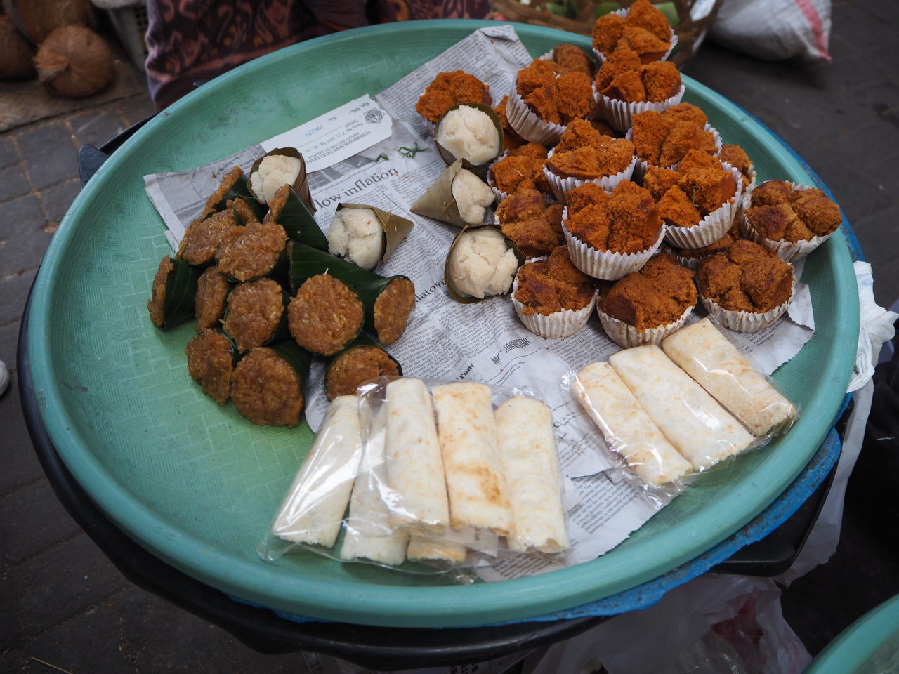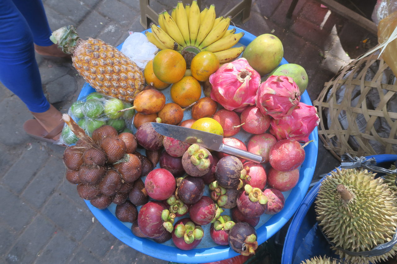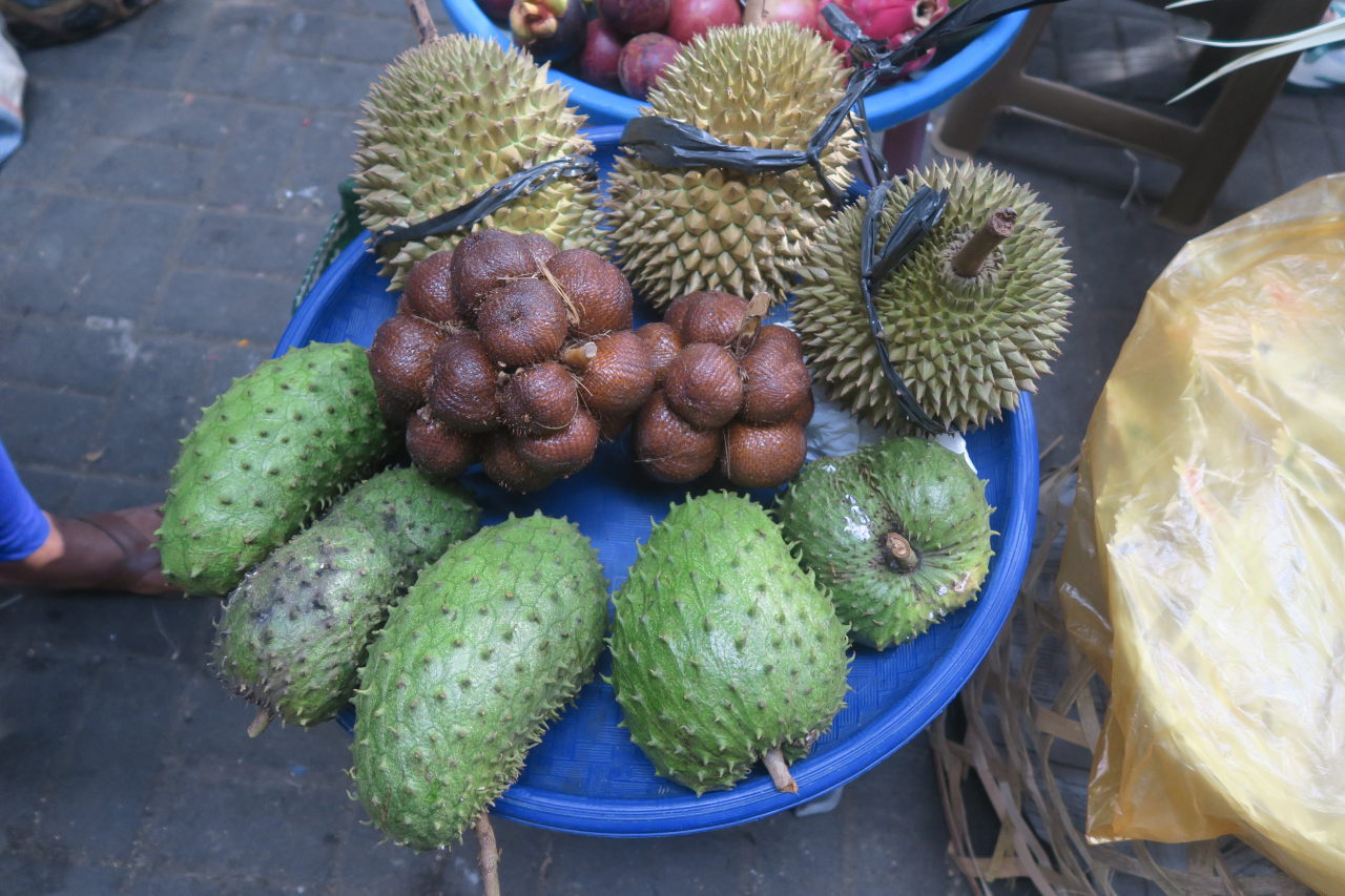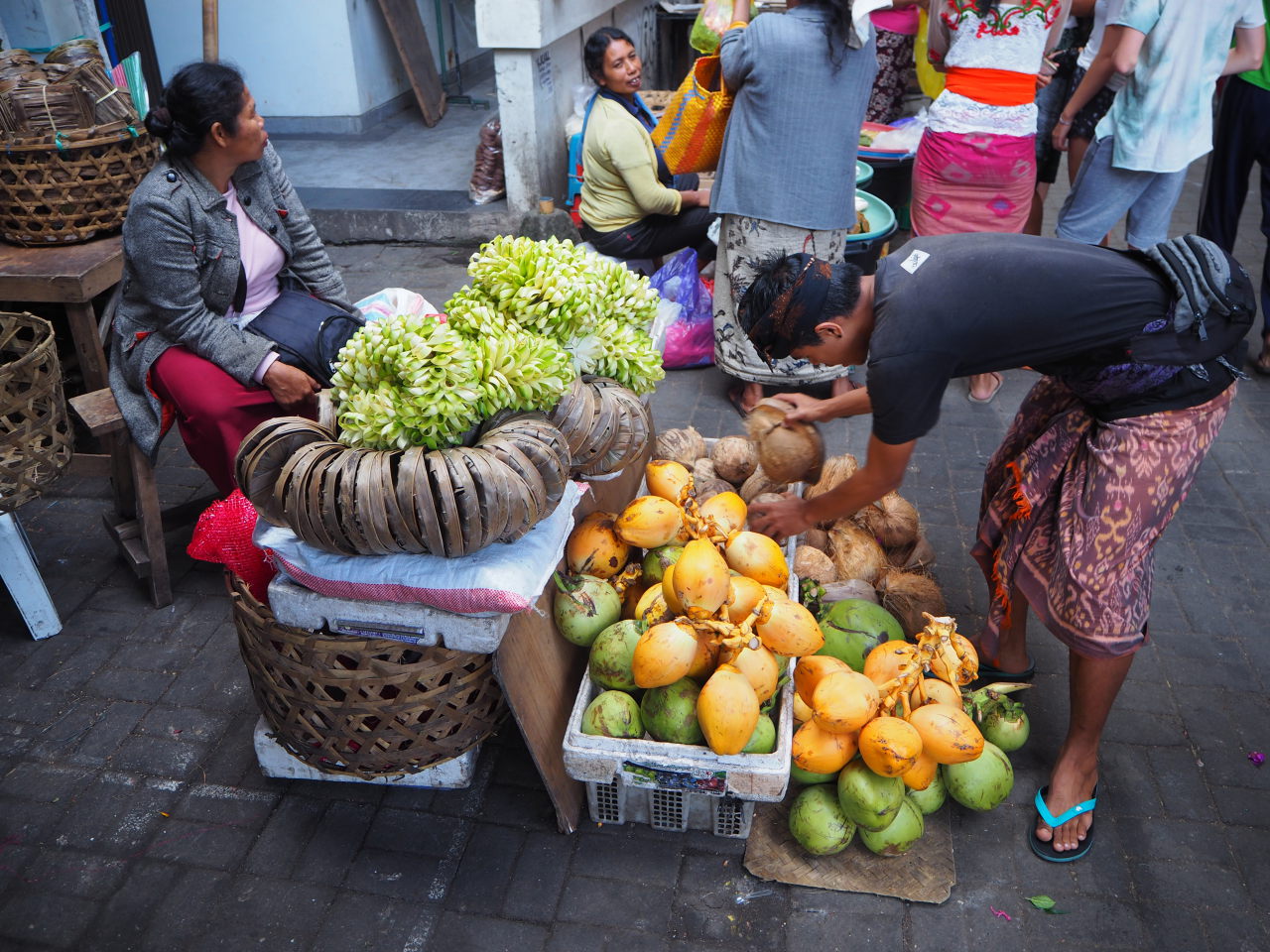 Le marché d’Ubud ouvre ses portes à 4h du matin pour les locaux. En vente : produits frais, poissons sous glace, viandes, légumes, fruits, épices, fleurs pour les offrandes aux temples, etc.