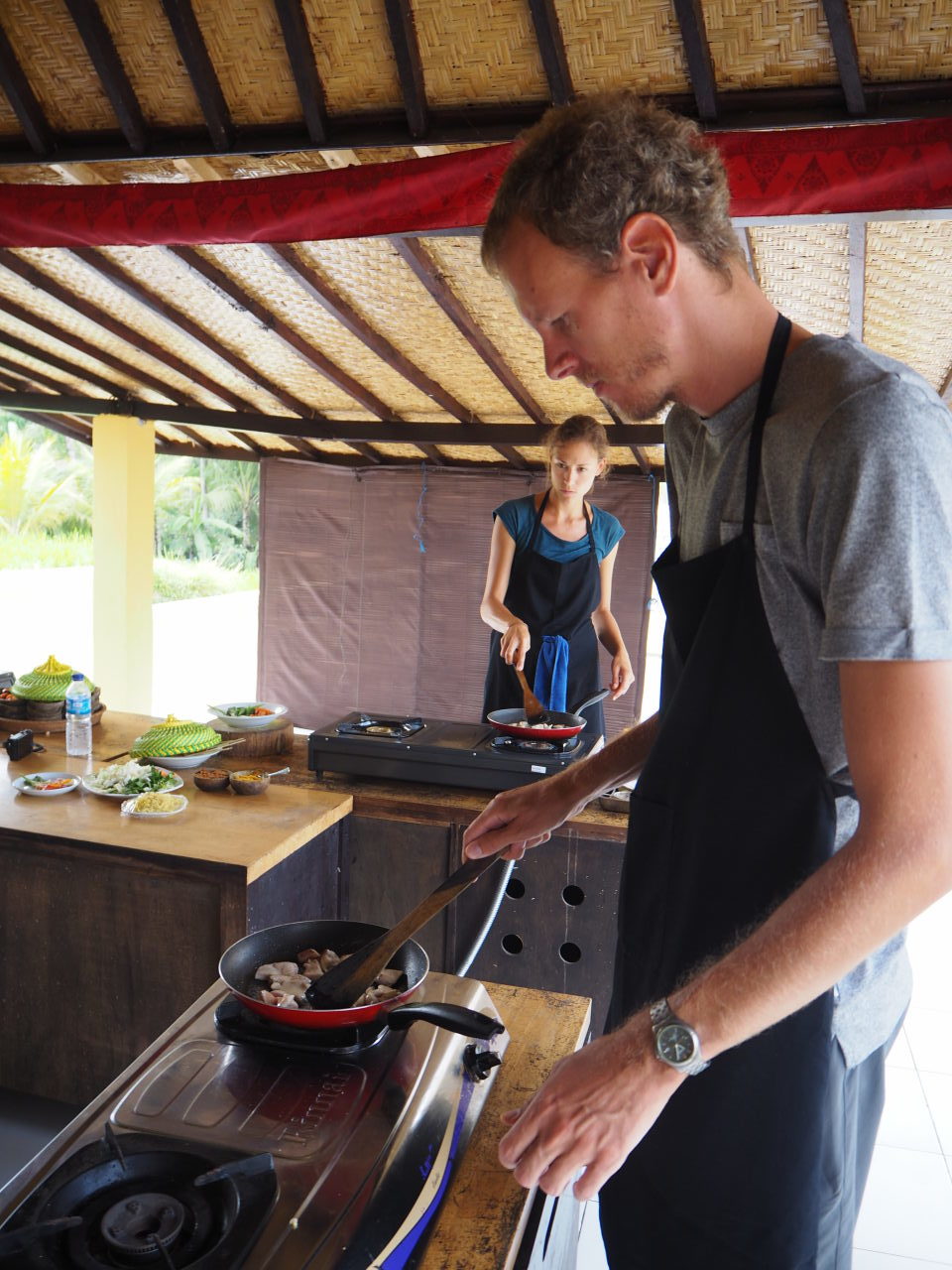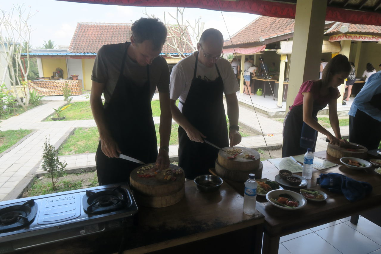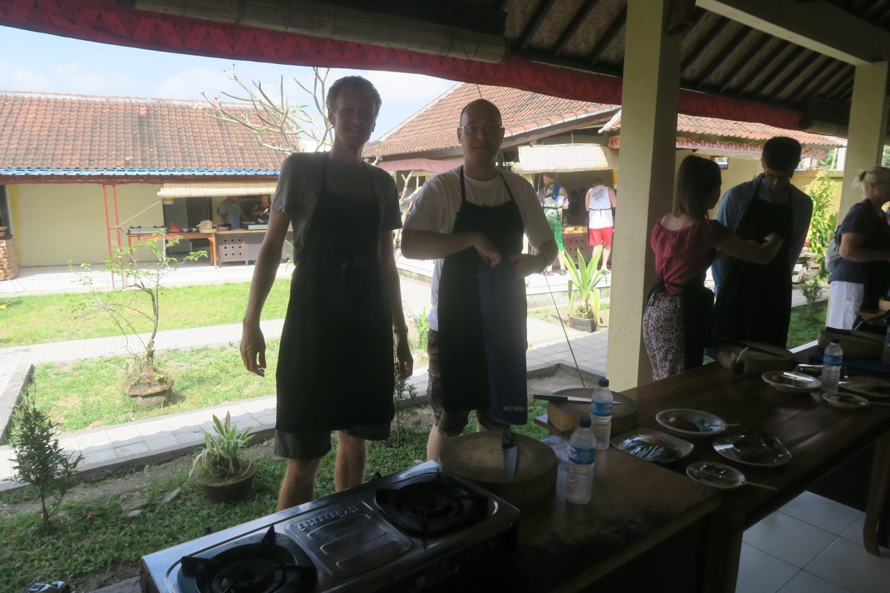 Nous avons choisi le cours de cuisine « Ketut’s cooking class », bien classé sur tripadvisor (et surtout qui avait encore de la dispo la veille pour le lendemain). Nous sommes très nombreux dans cette cuisine géante divisée en deux parties. Notre groupe contient 7 stands de 2 personnes. Julien et Clément feront équipe et Elise sera seule avec ses casseroles. Notre chef et ses assistants sont vraiment gentils et ont beaucoup d’humour, ce qui rend le moment très agréable.