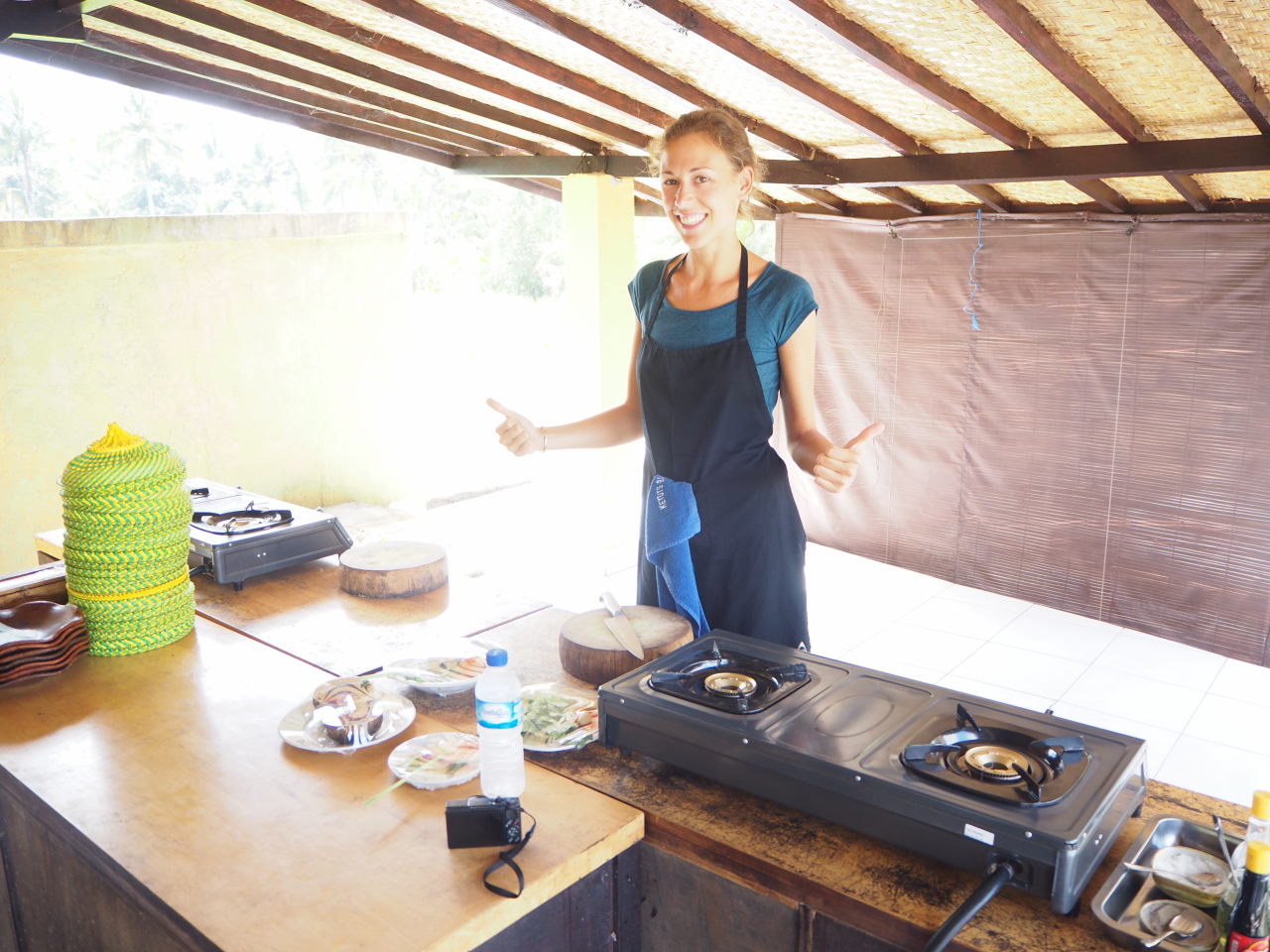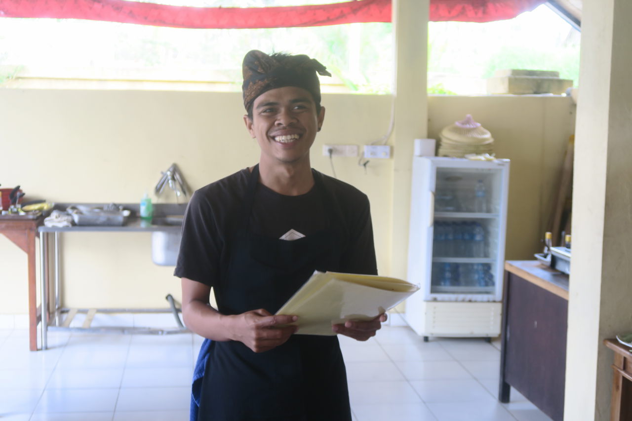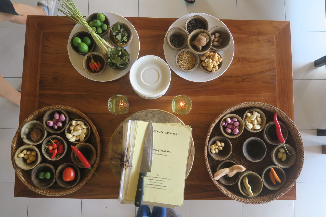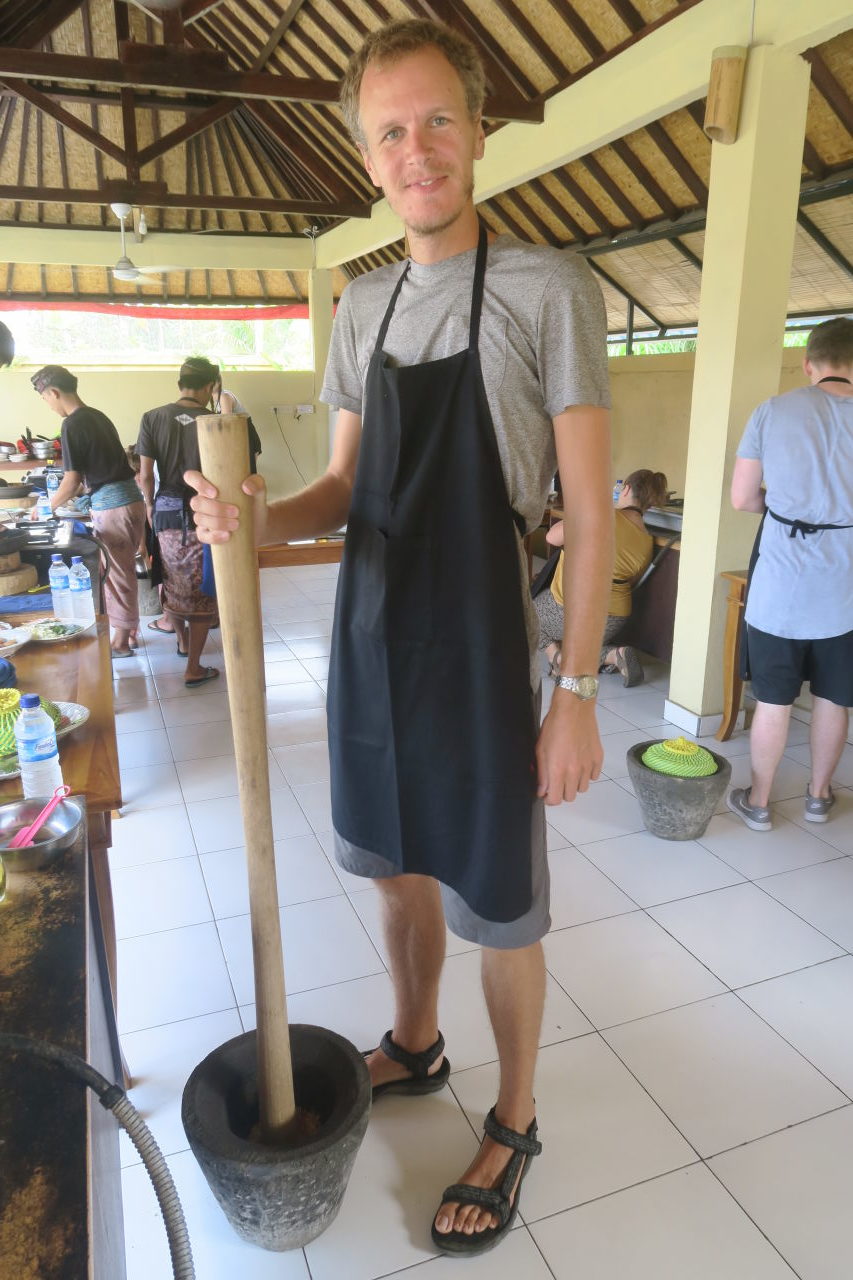 Nous avons choisi le cours de cuisine « Ketut’s cooking class », bien classé sur tripadvisor (et surtout qui avait encore de la dispo la veille pour le lendemain). Nous sommes très nombreux dans cette cuisine géante divisée en deux parties. Notre groupe contient 7 stands de 2 personnes. Julien et Clément feront équipe et Elise sera seule avec ses casseroles. Notre chef et ses assistants sont vraiment gentils et ont beaucoup d’humour, ce qui rend le moment très agréable.