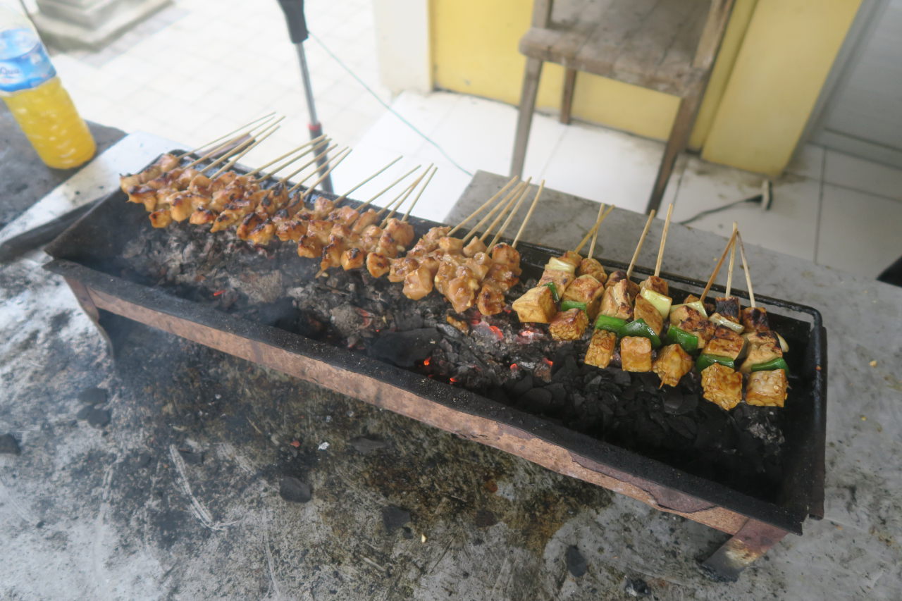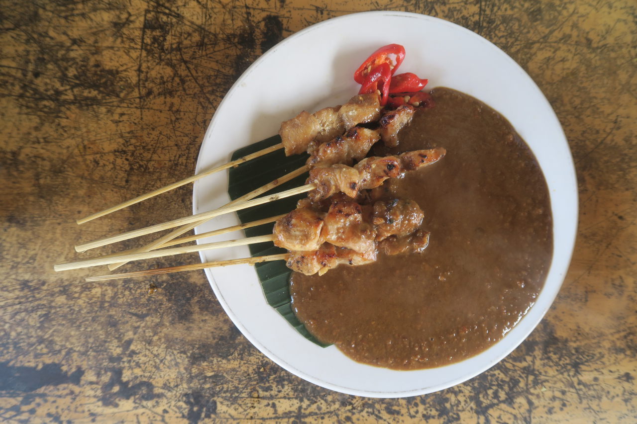 Petites brochettes de poulet (uniquement 3 petits bouts dessus) cuites au grill et servies avec une sauce à la cacahouète. La sauce Satay joue le rôle principal dans ce plat, il vaut mieux la réussir :)