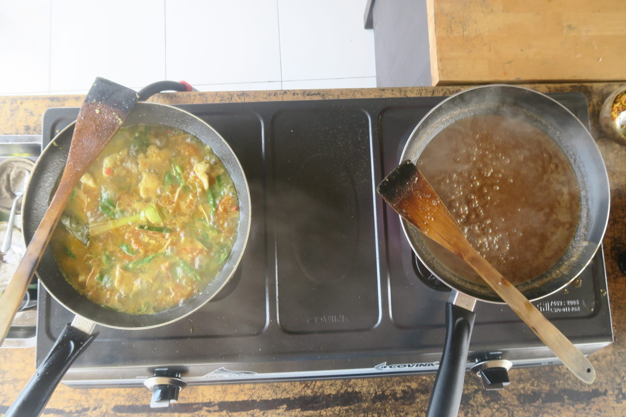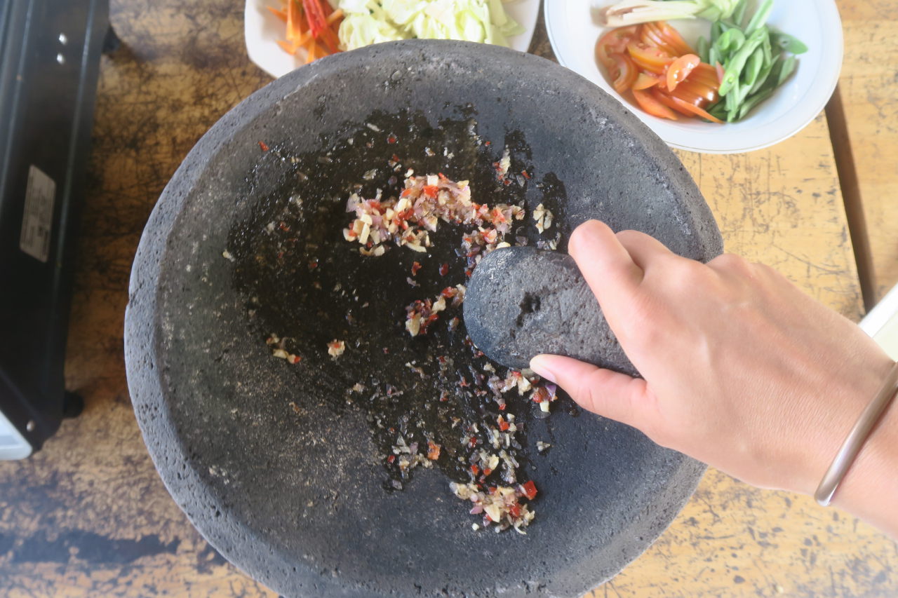- préparation du bumbu Bali (épices) qui permet ensuite de faire le « Ayam » (poulet) et le « Pepes » (poisson)