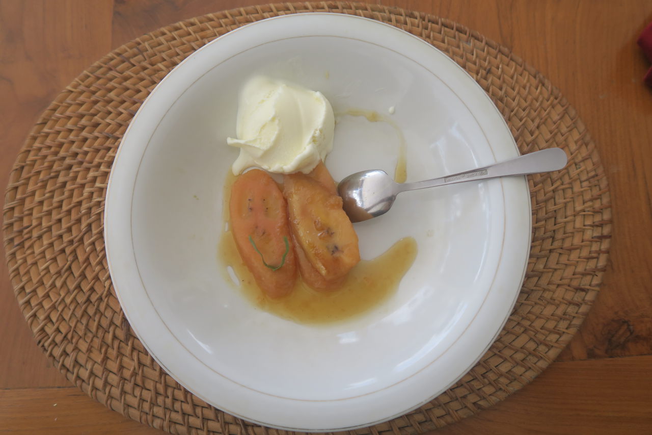 Bananes cuites dans un sirop de sucre de palme. Avec une petite boule de glace vanille, c’est topissime !