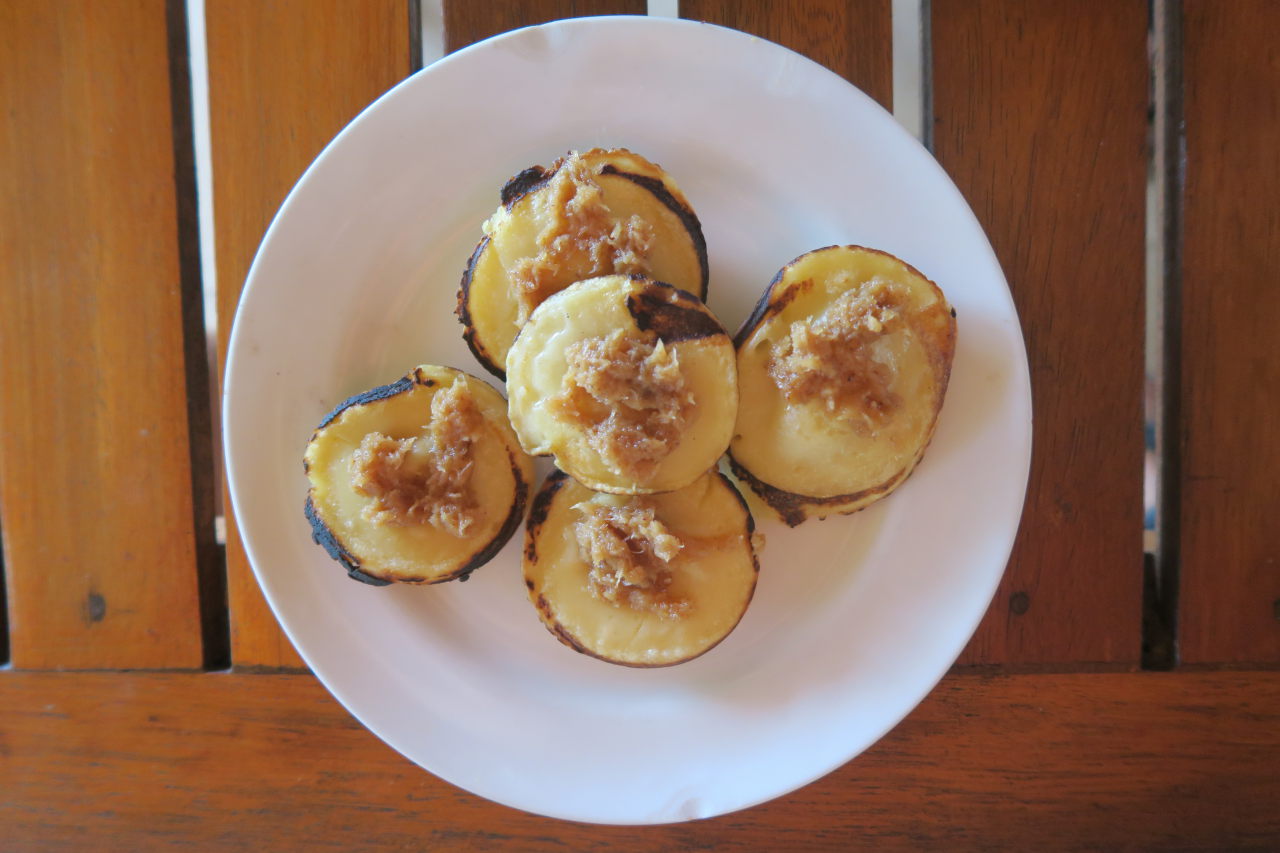 Petites crêpes épaisses (presque des pancakes), parfois vertes (quand parfumées au pandan, faites à base de farine de riz. À l’intérieur ou au dessus, le fourrage est constitué de sucre de palme et de noix de coco râpée et grillée.