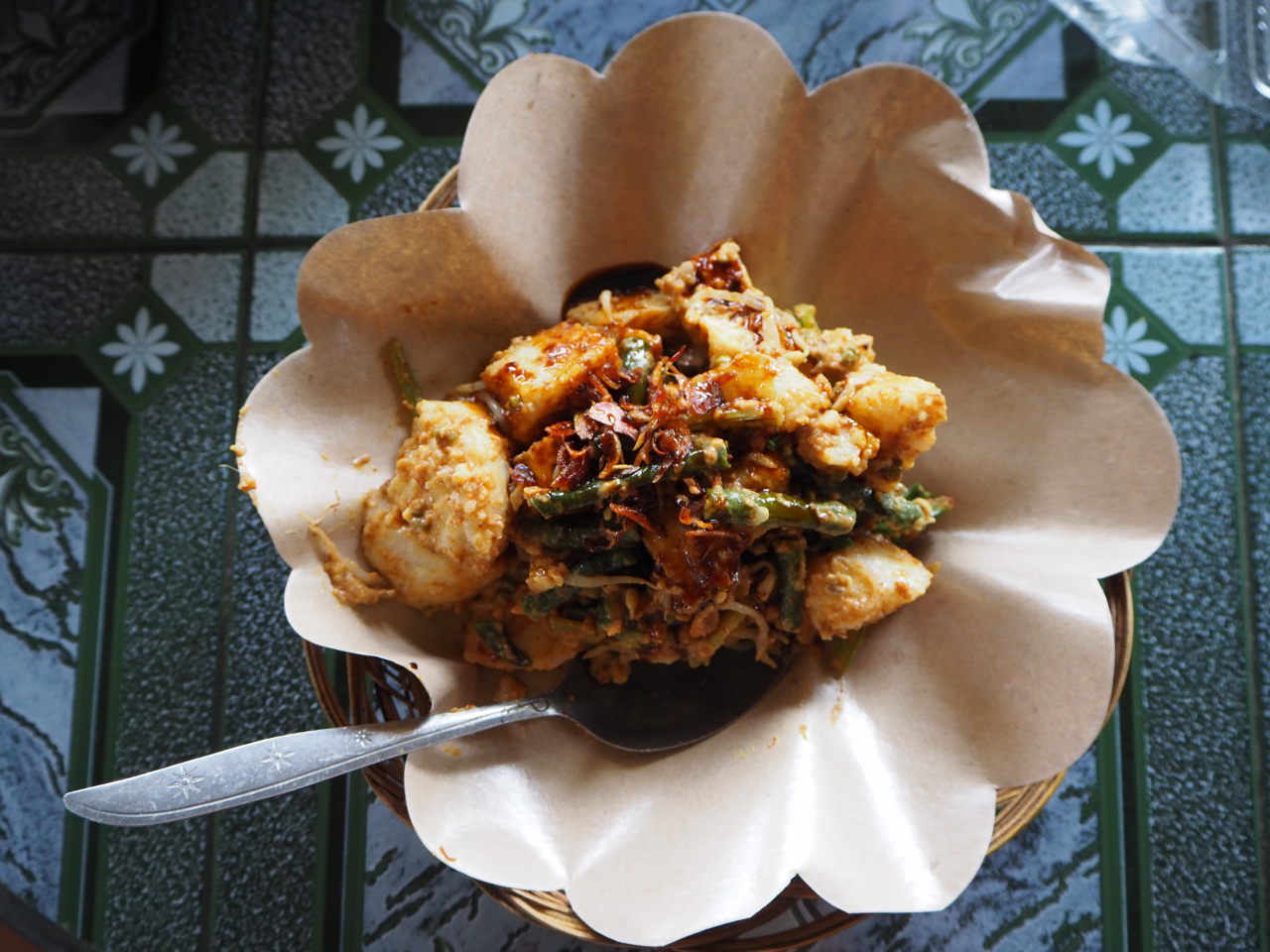 C’est un plat froid avec des légumes cuit à la vapeur, morceaux de riz bouilli, tofu frit et sauce à la cacahouète.