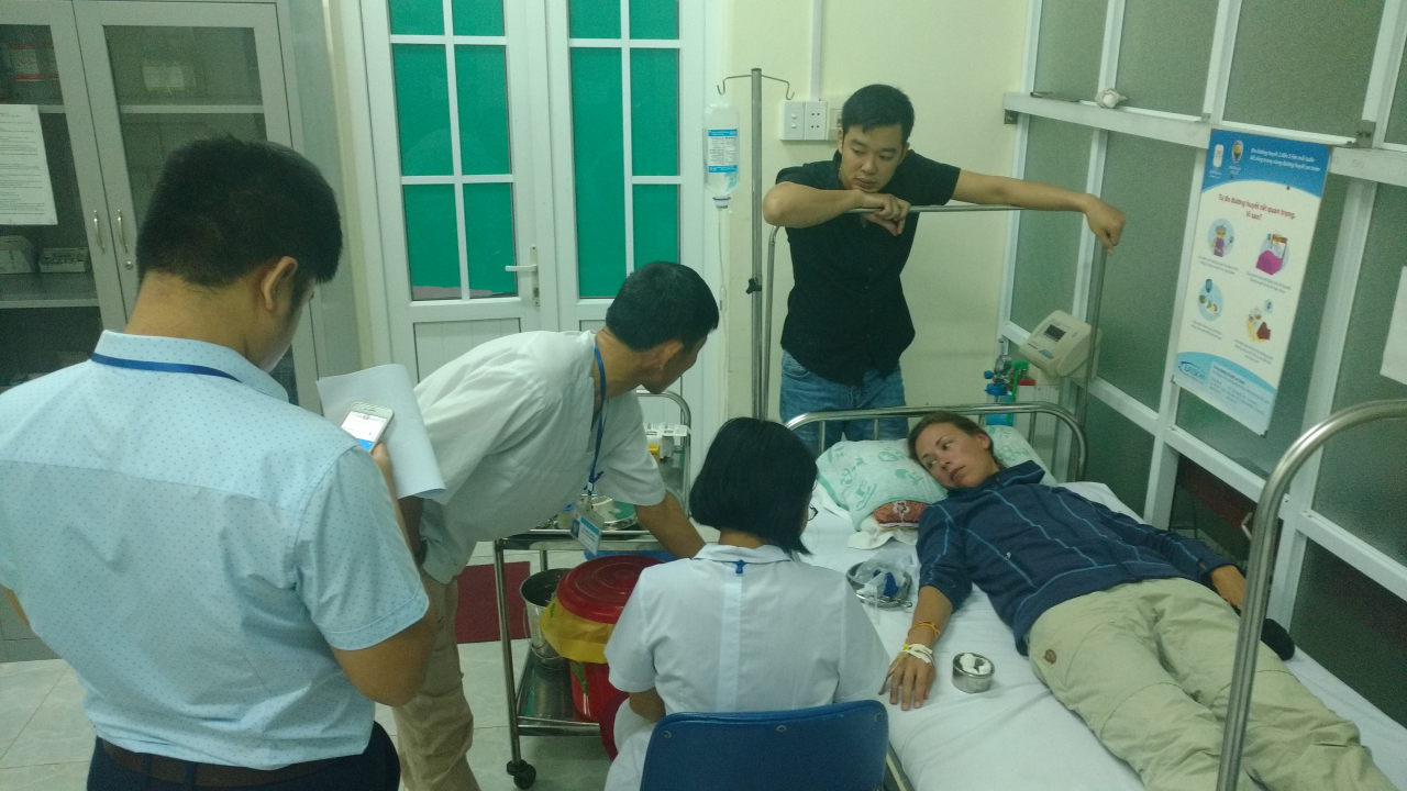 Arrivés à Ha Giang, Julien dépose Elise transie dans la chambre d’hôtel, puis gère l’intendance (moto à rendre, sacs à récupérer). On nous indique une école de médecine avec des docteurs parlant anglais. Arrivés sur place, ce seront pas moins de 5 médecins qui entoureront Elise pour comprendre ce qui se passe. On a un peu l’impression d’être une attraction, tout ça les fait rigoler.