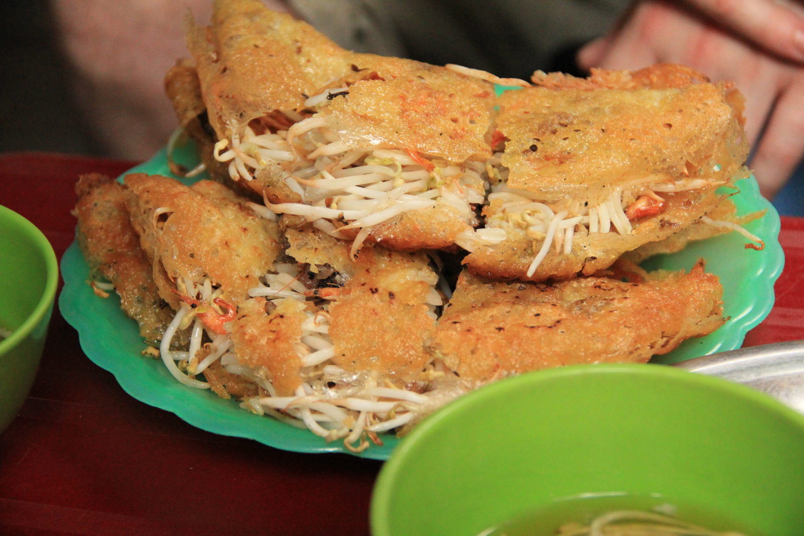 C’est une spécialité de la région du delta du Mékong. C’est une crêpe faite à base de farine et de curcuma, garnie de pousse de soja, de viande ou de crevettes. Ce plat typique du sud est aussi consommé au nord du pays. Cependant, la crêpe de base est bien plus petite et les garnitures peuvent varier d’une région à une autre. Nous avons beaucoup vu ce plat dans les marchés de rue.