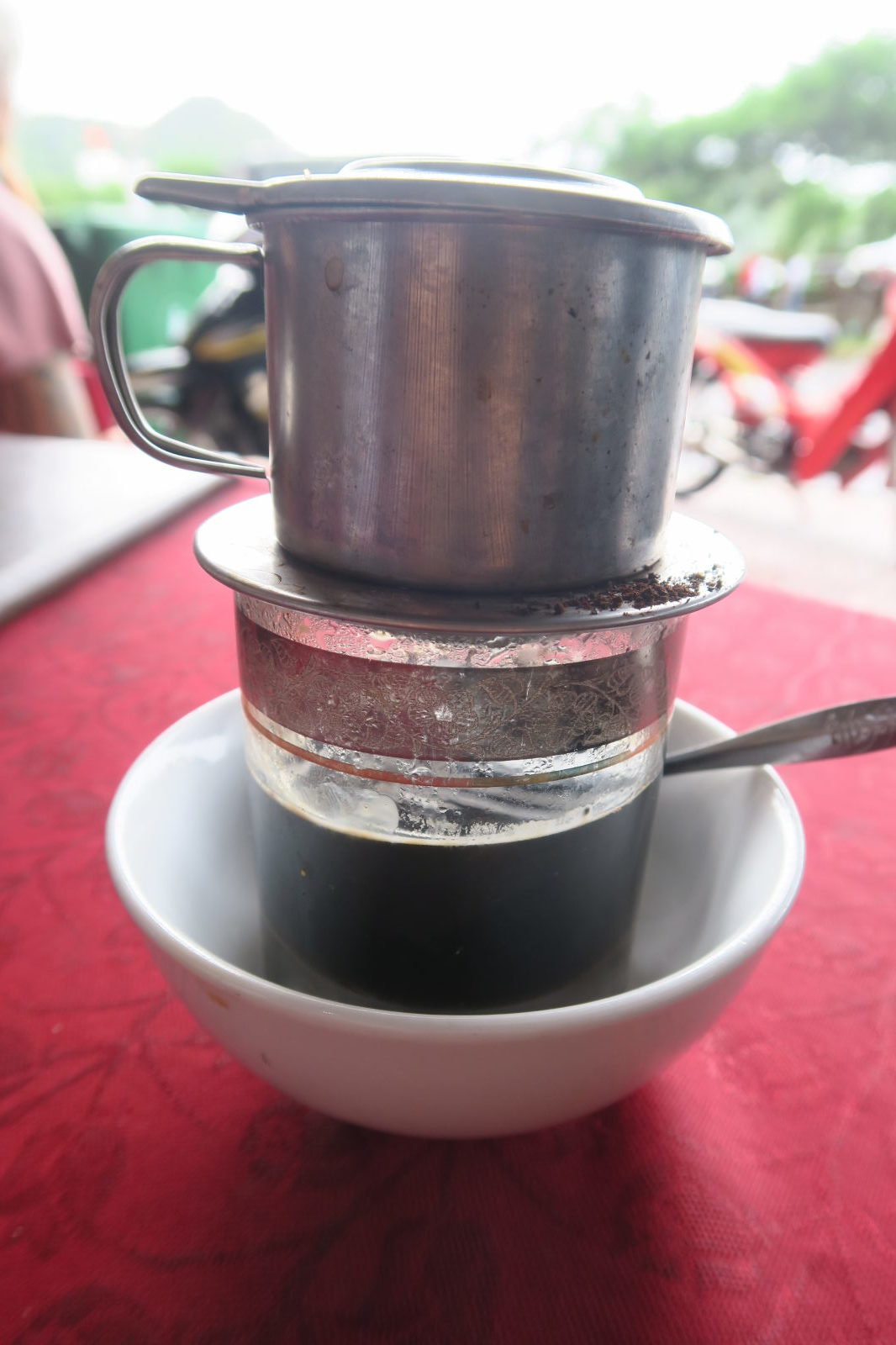 On le sait peu (en tout cas pour nous) mais le Vietnam est le deuxième producteur mondial de café (variété robusta, plus forte que l’arabica), après le Brésil. C’est aussi un pays consommateur, mais moins que les pays occidentaux. C’est donc une boisson largement répandue, le plus souvent sous forme de café filtre : on vous sert une tasse surmontée d’un petit filtre empli d’eau bouillante… reste à laisser passer sans être pressé !
