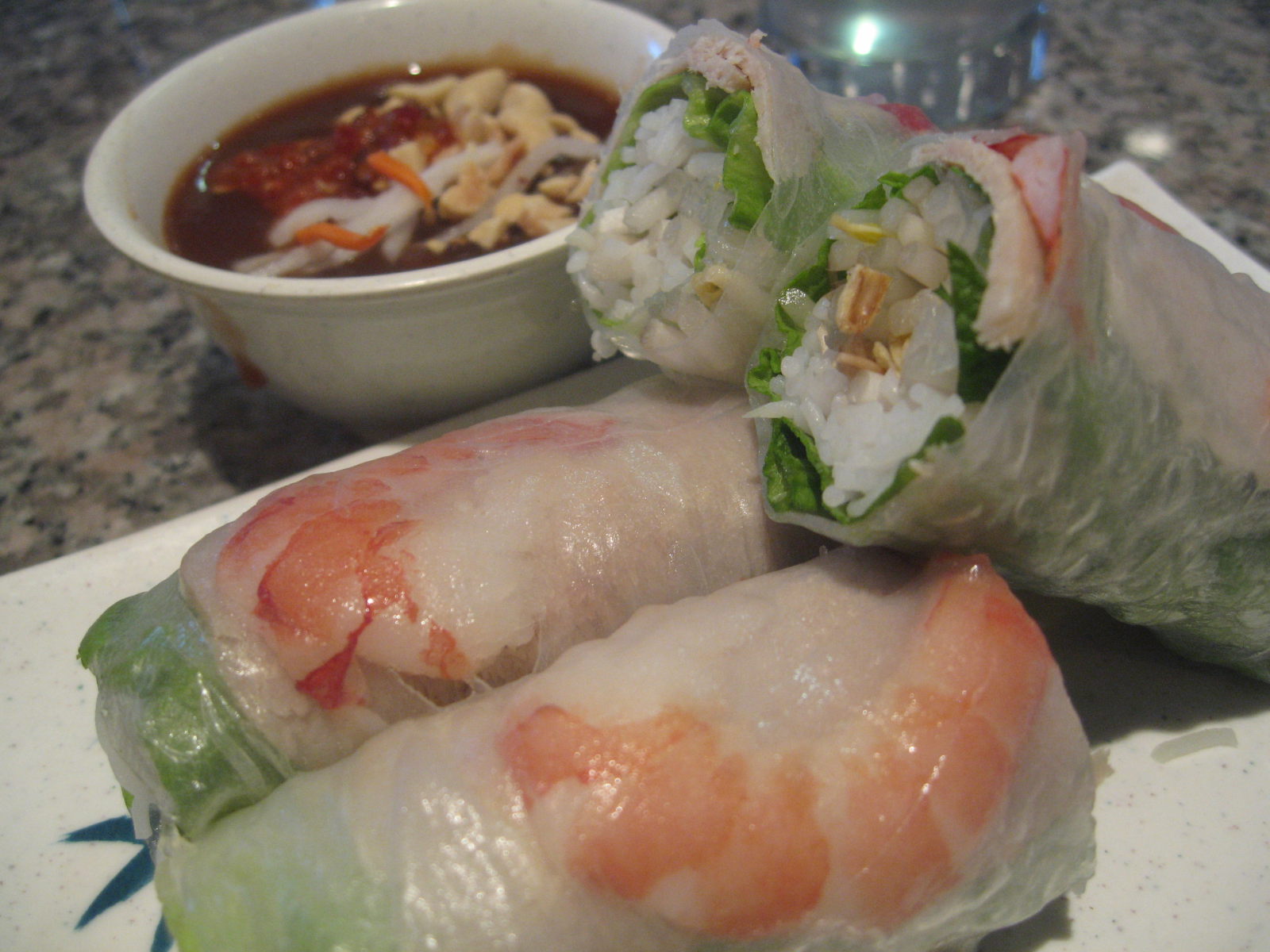 Il est composé d’une galette de riz, enroulée le plus souvent autour d’une feuille de salade, de menthe, d’herbes fraîches, de quelques pousses de soja et de vermicelles de riz. On choisit de le déguster au poulet, au porc, au bœuf ou aux crevettes, le tout accompagné de sauce nuoc-mâm. À l’origine, les Vietnamiens le mangeaient lors de la fête du Têt, le nouvel an vietnamien, qui célèbre l’arrivée du printemps. À ne pas confondre avec son voisin chinois, souvent servit frit, le rouleau de printemps vietnamien se mange froid, en entrée ou à l’apéritif.
