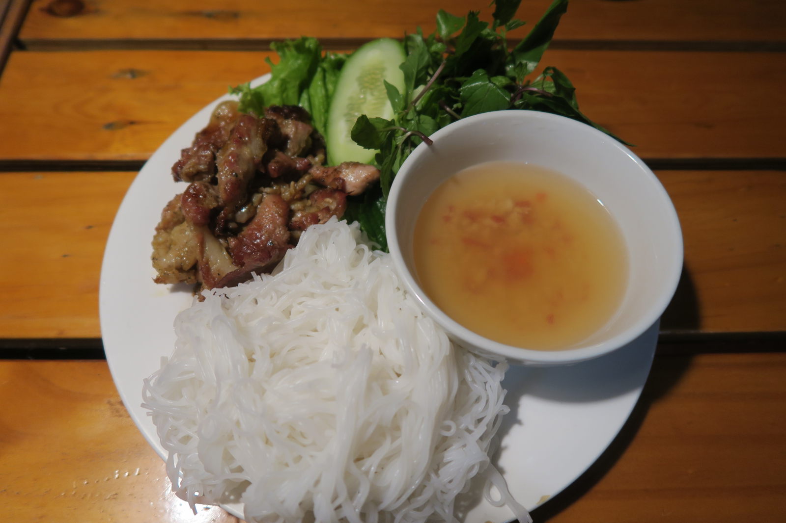 Le Bun Cha est un plat originaire du nord du Vietnam et plus précisément de Hanoi. Il est fait à base de boulettes de viandes et de fines lamelles de viandes cuites au charbon. Elles sont servies avec de le vermicelle de riz, une riche variété d’herbes aromatiques (menthe, coriandre, salade verte…etc.) et un bol de sauce/ bouillon aigre-doux avec de fines tranches de carottes et de papaye marinées au vinaigre. Très bon.