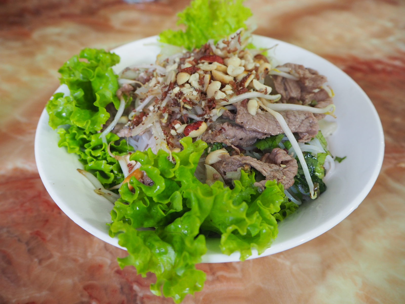 Appelé aussi bún bò, est un plat qui se mange froid. Il est composé de vermicelles de riz, de lamelles de bœuf sauté, de crudités et d’herbes aromatiques, le tout assaisonné de sauce nuoc-mâm.