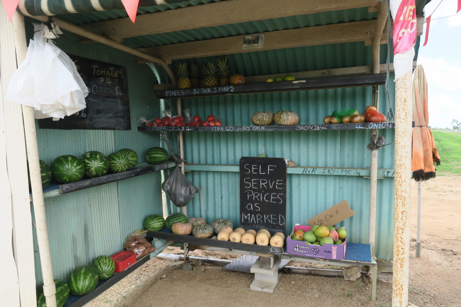 Après cette bouffée d’air frais en forêt, retour vers la côte ! Sur la route, nous voyons des panneaux de vente de fruits et légumes locaux ! Chouette, on décide de s’arrêter. Mais en arrivant, on se rend compte que c’est un self-service et que les gens doivent mettre la monnaie dans une boite en fer rouge ! Incroyable la confiance qui est accordée ici !
