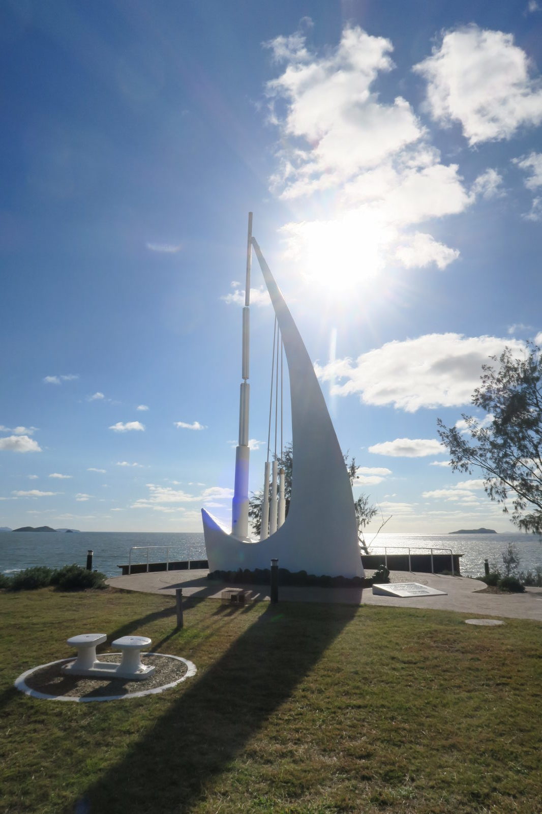Douche froide avec les hirondelles locales dans les équipements du parc, puis petite promenade matinale vers le « Singing Ship Monument », érigé en mémoire du premier voyage du Capitaine Cook en Australie. Après quelques photos sur la jetée, on remet les voiles vers Agnès Water et la ville qui s’appelle « 1770 » !