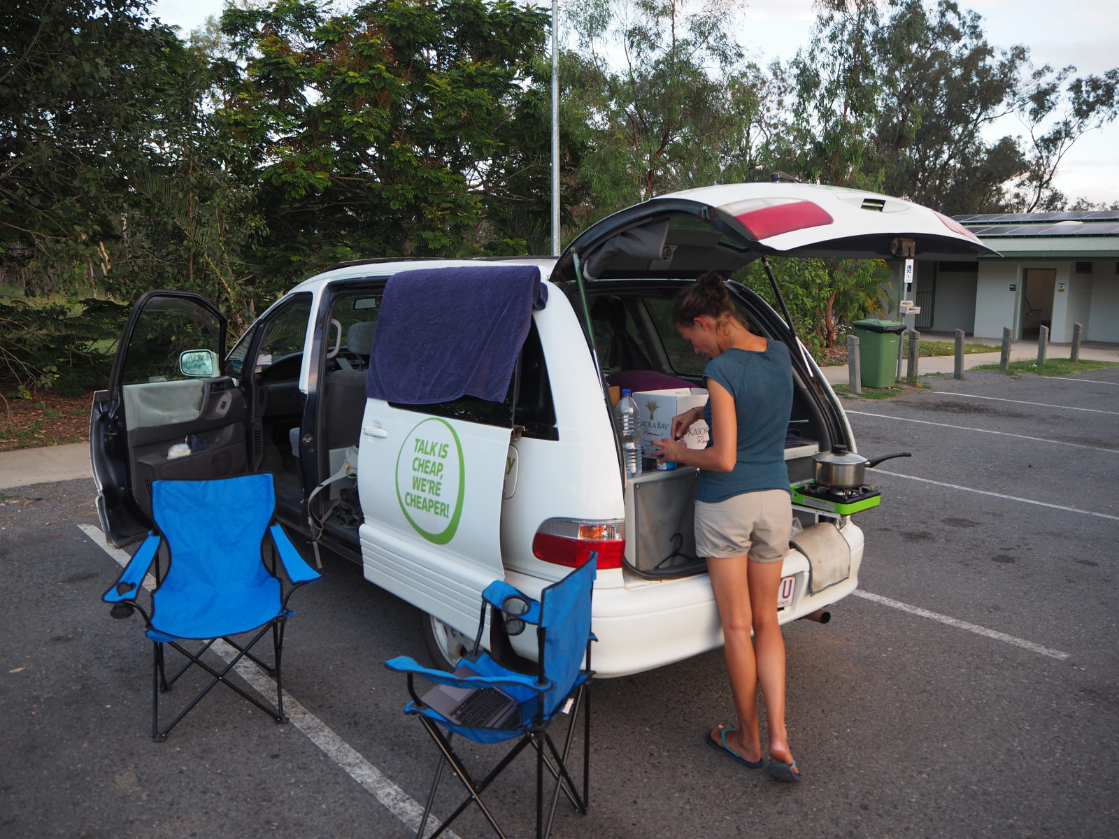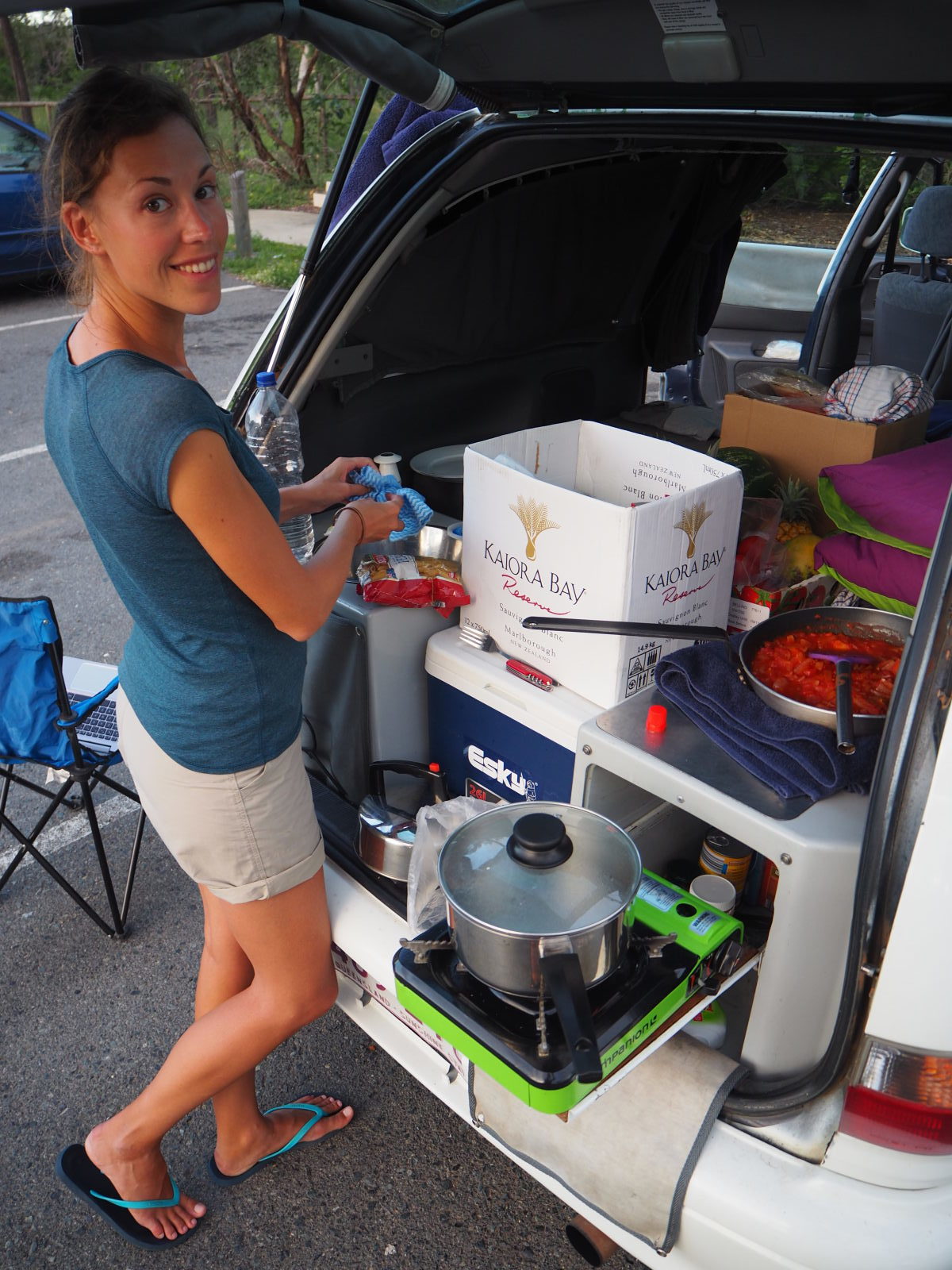 Nous voilà donc à la recherche d’un lieu sur l’application Wikicamps où l’on peut rester légalement gratuitement pour la nuit, sans risque de se faire réveiller par les rangers au petit matin et d’avoir une amende ! On finit par en trouver un, à l’entrée d’un parc national en quittant Agnès Water. Idéal, à première vue, et en plus il n’y a personne ! On s’installe donc et on commence a préparer à manger avant que le soleil ne soit couché.