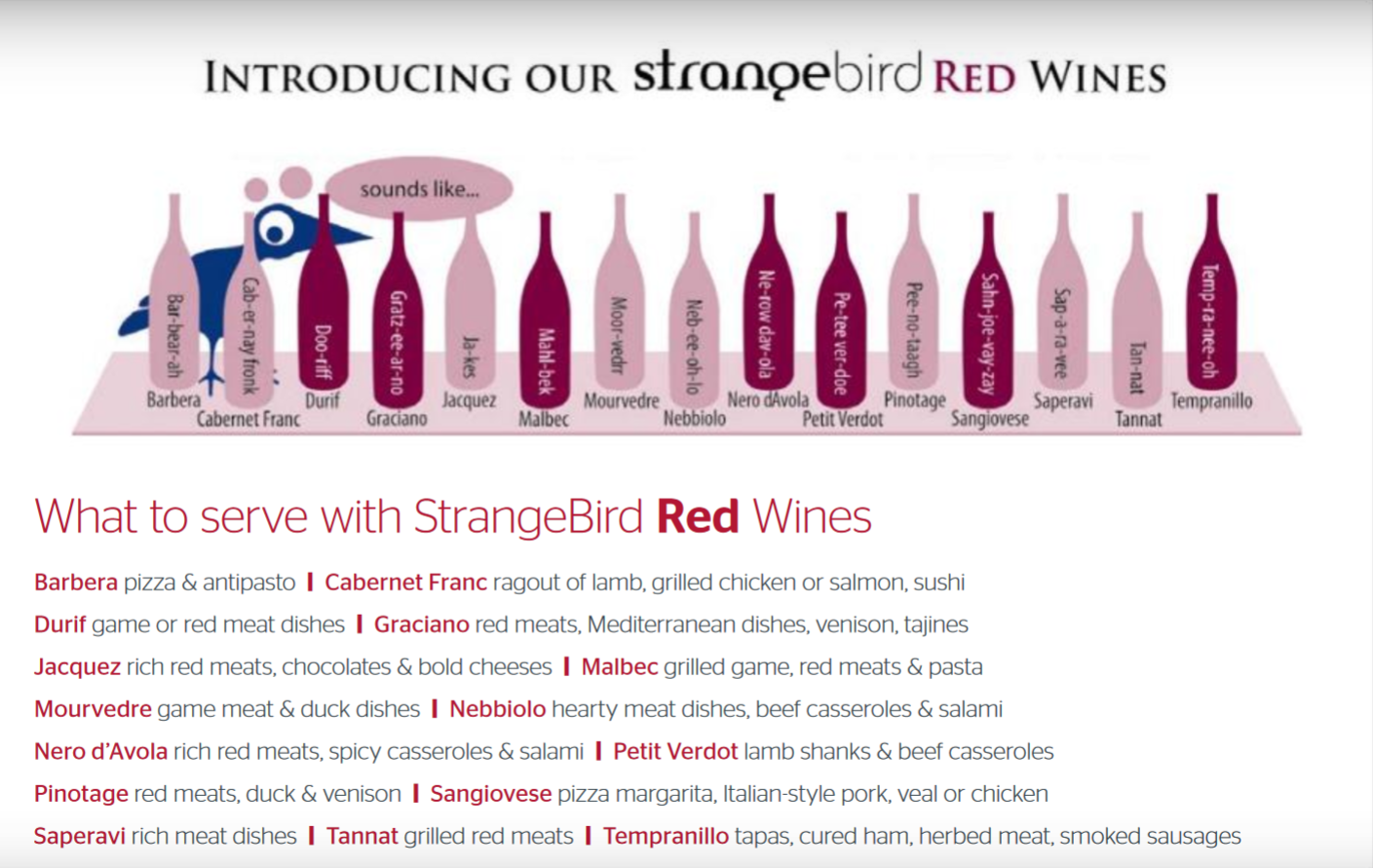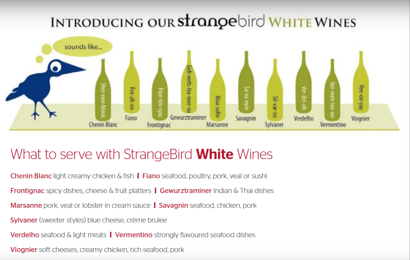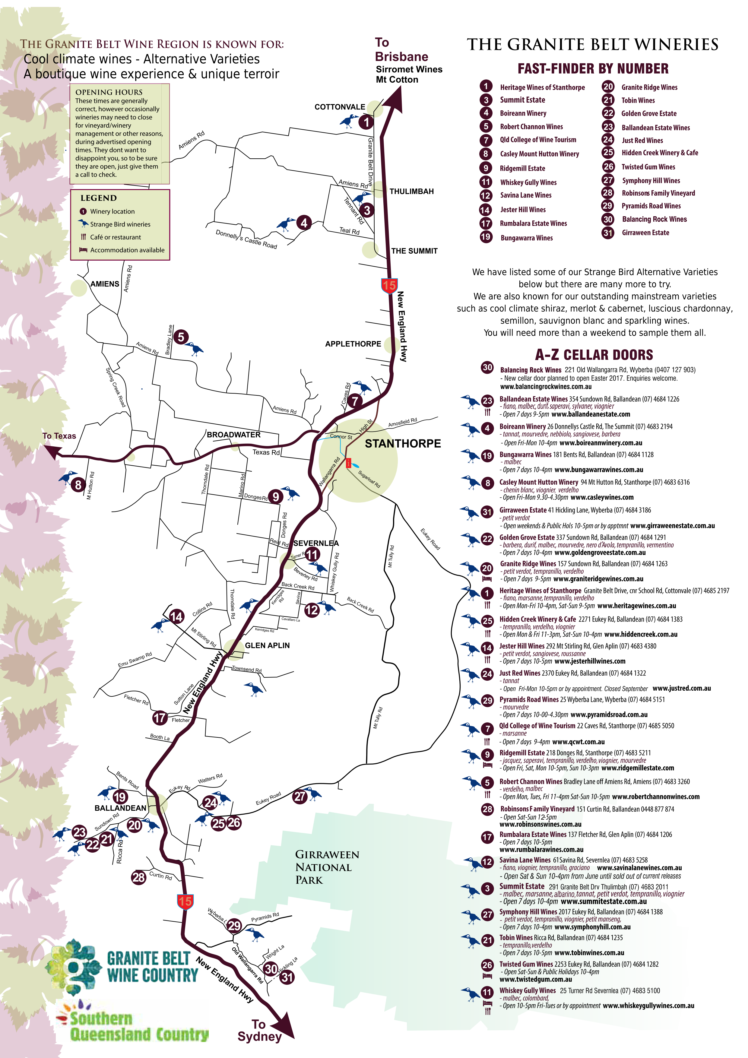 Par ailleurs, les producteurs de la « Granite Belt » mettent en avant des variétés alternatives appelées « Strangebird », qui sont des cépages beaucoup moins connus que les « poids lourds » habituels (Chardonnay, Shiraz, etc). Ces variétés connues en Europe émergent désormais en Europe. Elles ne doivent pas représenter plus de 1 % de la production de vin en Australie pour être considérées comme « alternatives ».