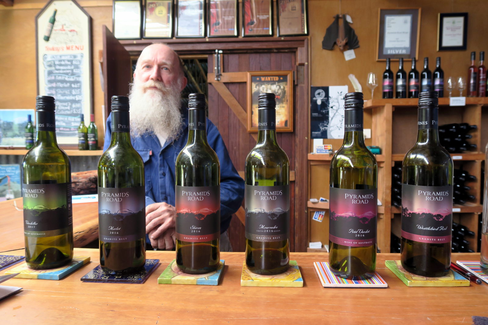 La région est également connue pour ses vins. Nous sommes donc passés chez un petit producteur l’après-midi. N’ayant pas vraiment fait de recherches, nous avons suivi le conseil d’un ranger et sommes allés dans la « winery » la plus proche du parc, la Pyramid Roads Winery. Alors que nous avions prévu de passer rapidement histoire de gouter quelques vins, nous avons été accueilli pendant au moins 2h par Warren, le vigneron ! Super sympa, il a partagé avec nous son expérience et nous a expliqué plein de choses sur son vin.