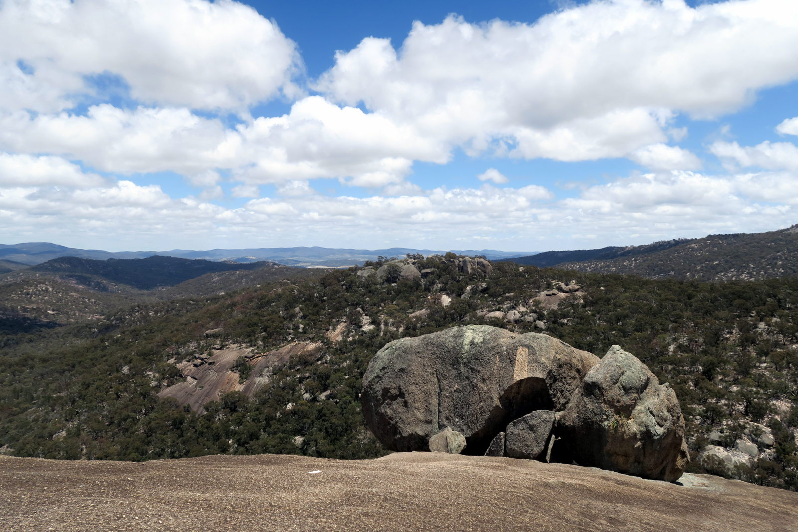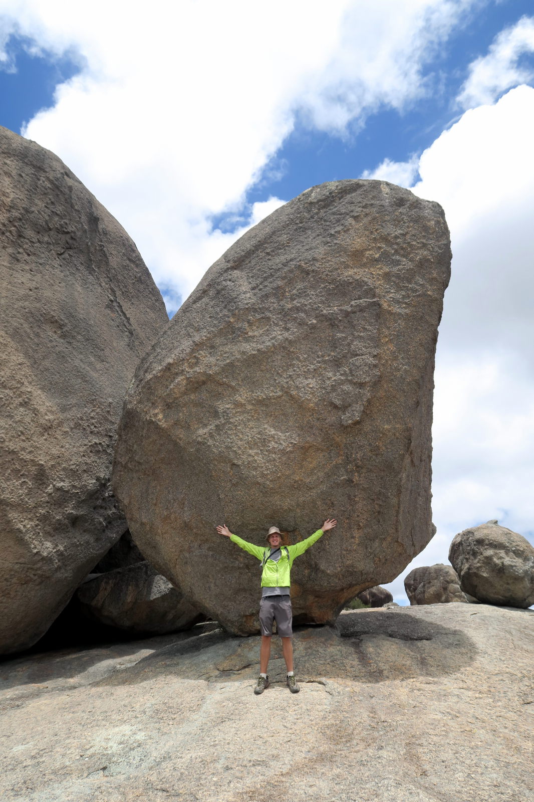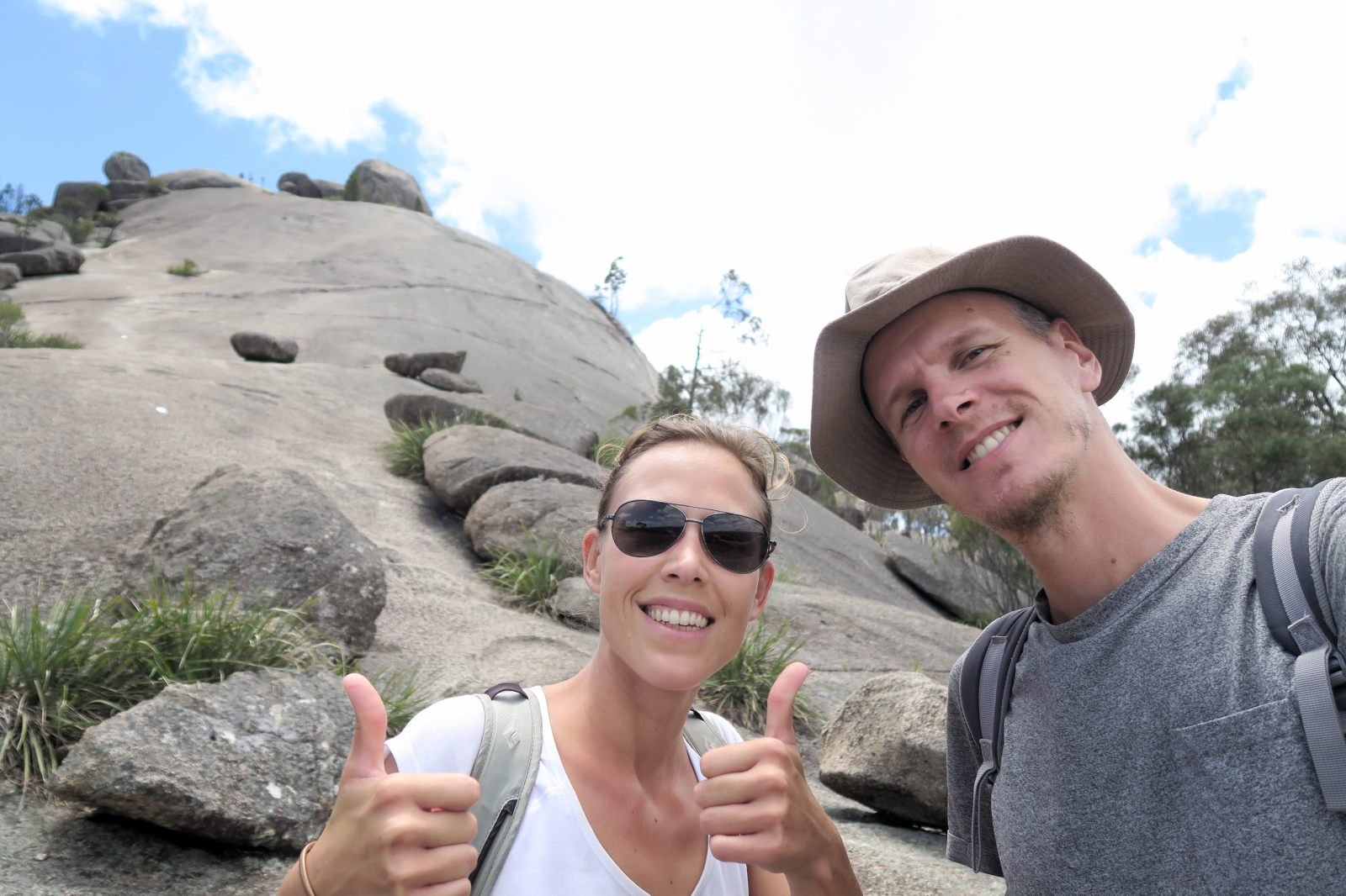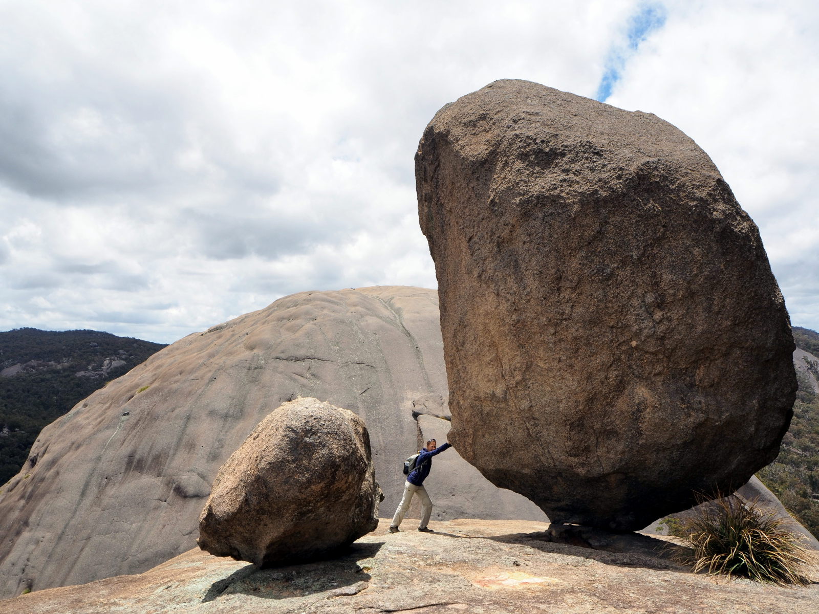 Direction le parc de Girraween à quelques kilomètres de là. Motivés et heureux de refaire une « petite » marche à pied (et oui, quand on voyage en voiture tout le temps et sur de longues distances, marcher est salvateur :) ), nous entreprenons de monter la « Pyramide ». C’est un bloc de granit qui finit bien raide (à ne pas faire en cas de pluie car très glissant !) et qui donne une belle vue sur les alentours. Au sommet de cette pyramide, on peut en admirer une deuxième juste derrière, ainsi qu’un énorme rocher en équilibre qui semble menacer de tomber tôt ou tard.