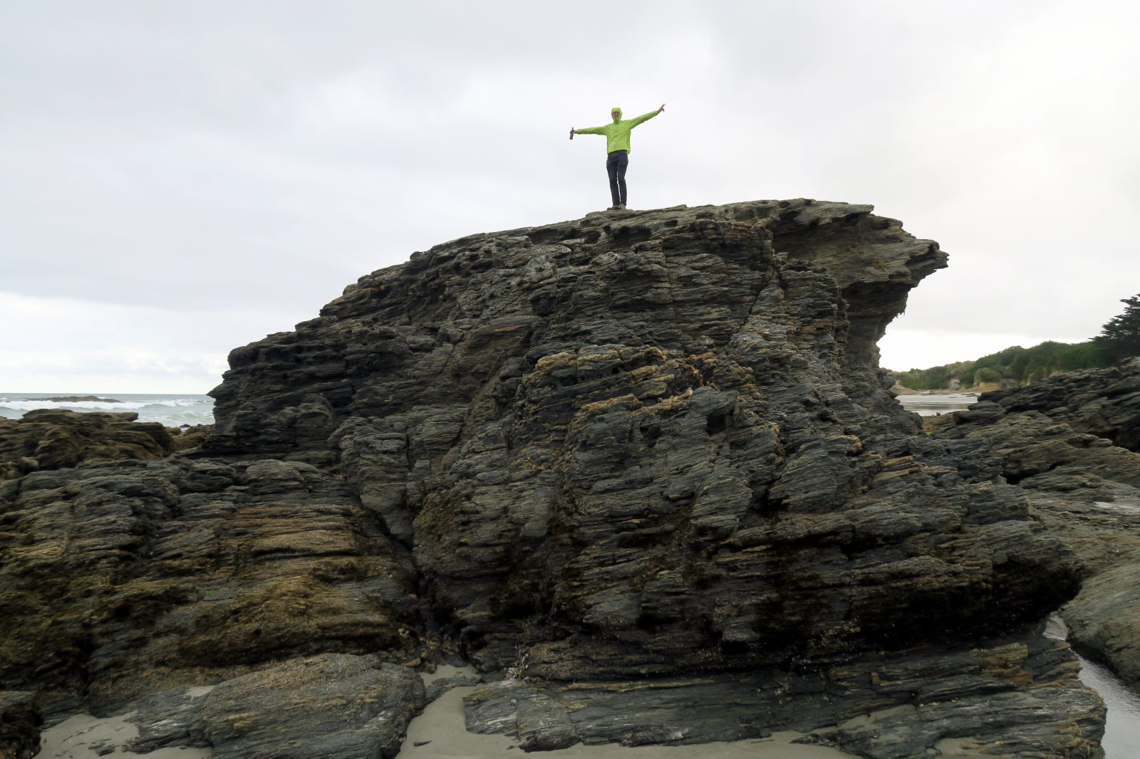 Une partie de cette couche est désormais visible à marée basse. De loin, il est difficile de comprendre ce que l’on regarde, mais lorsque l’on se rapproche, on constate au sol la présence de traces de troncs et de souches. C’est aussi une zone de nidification de pingouins aux yeux jaunes, mais nous n’en avons pas vu un seul !