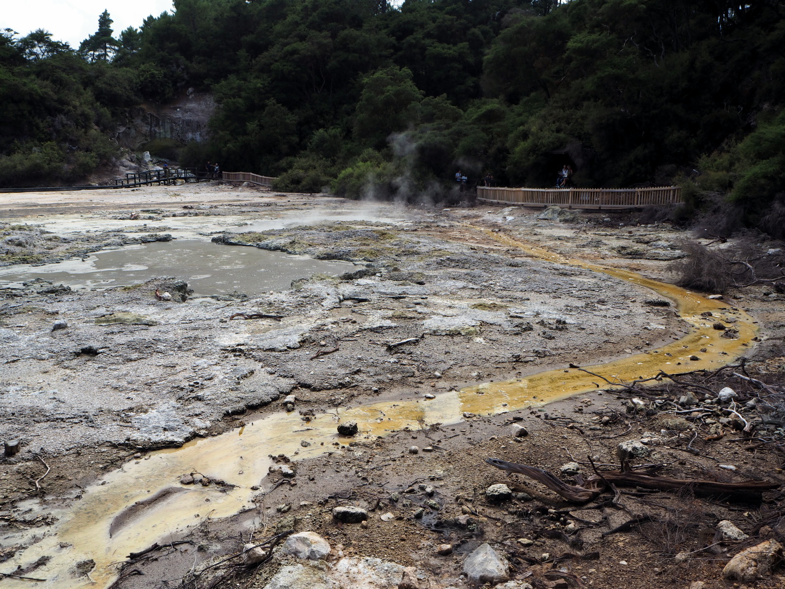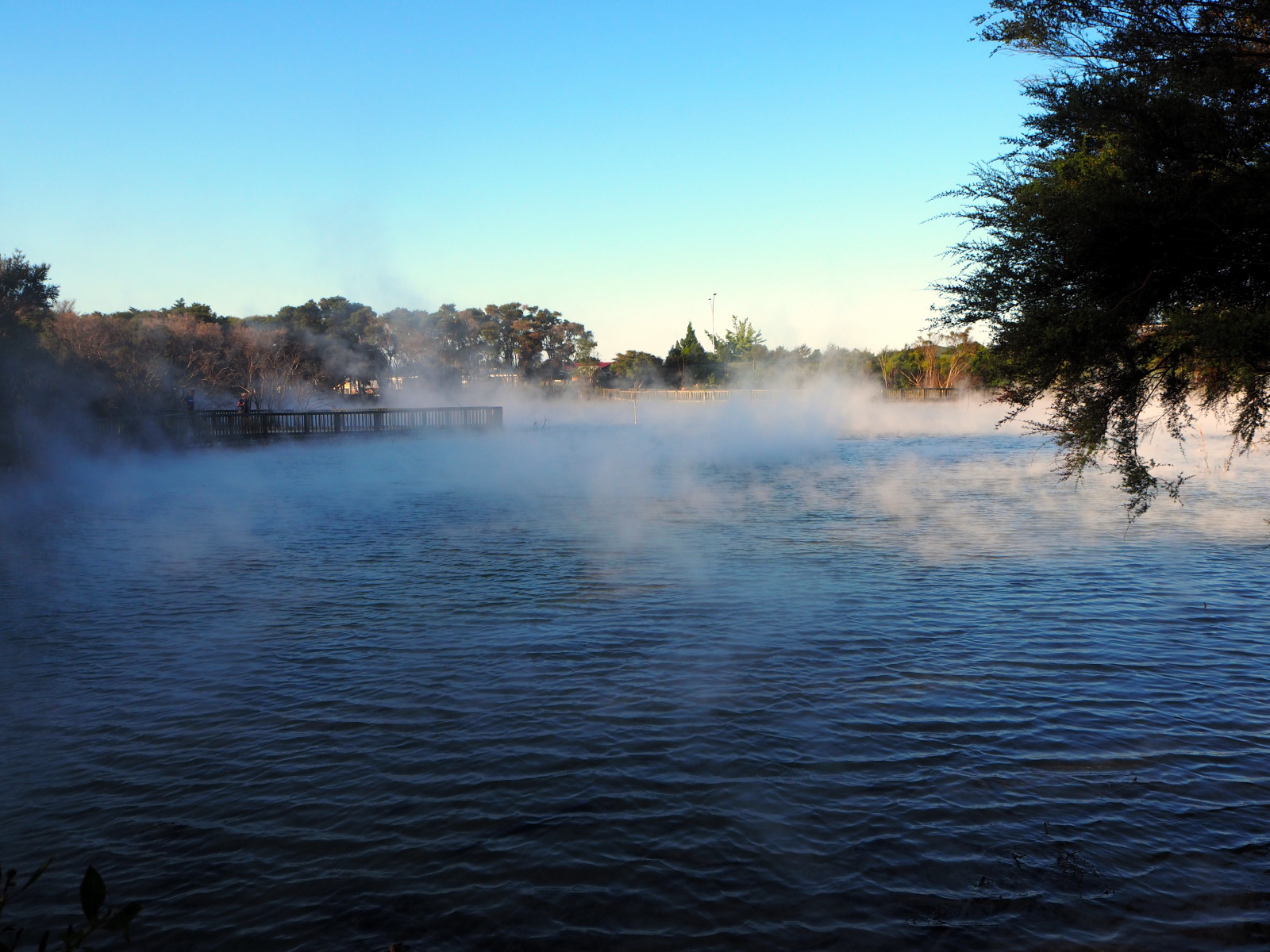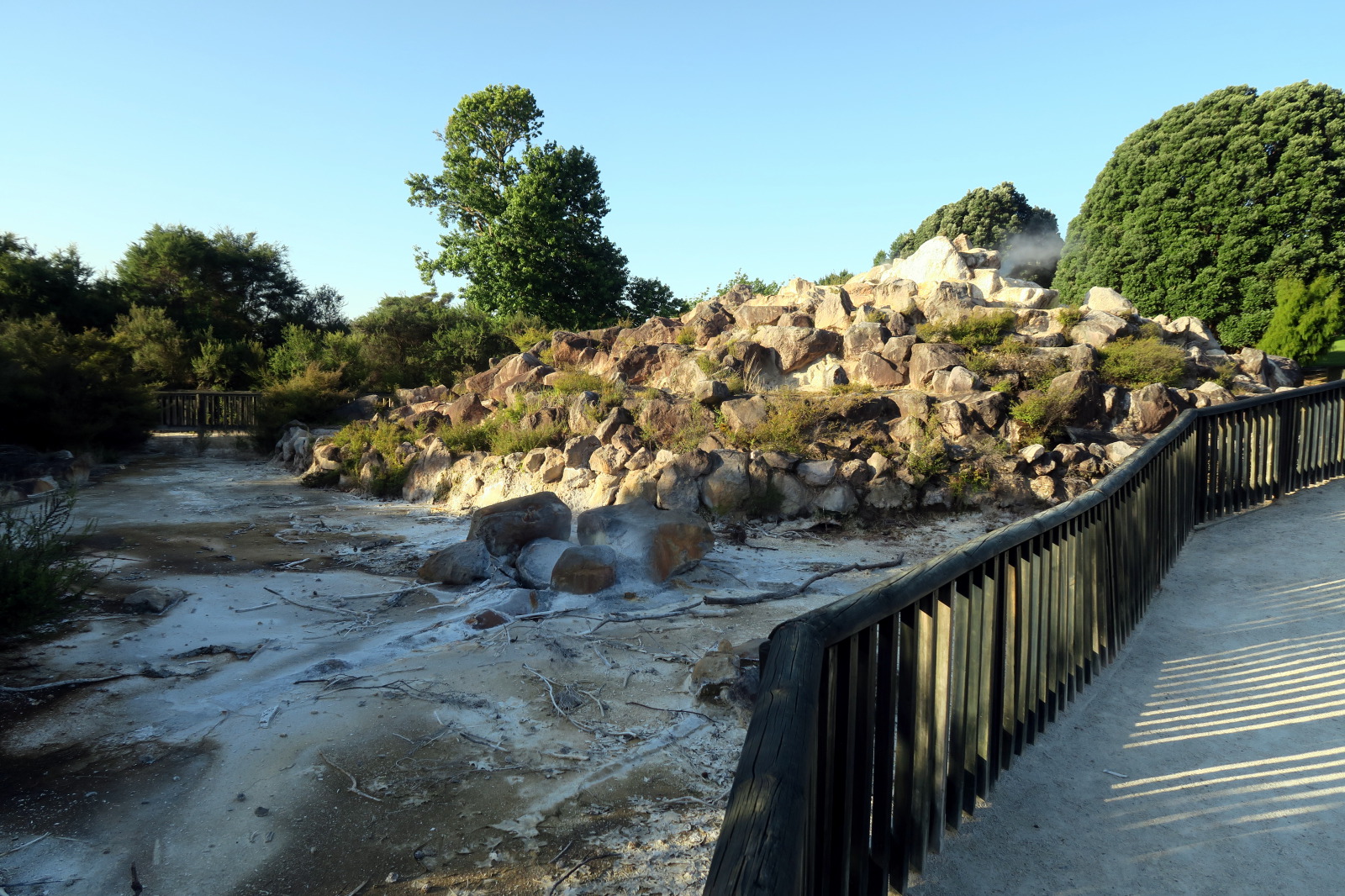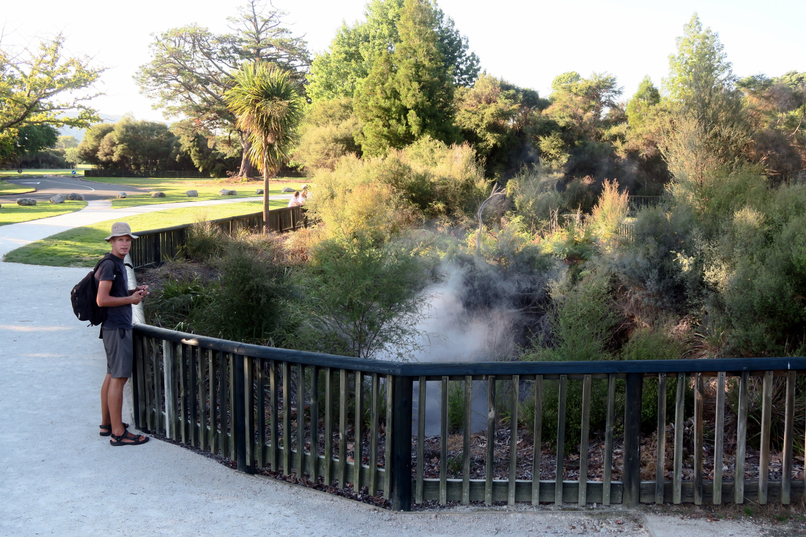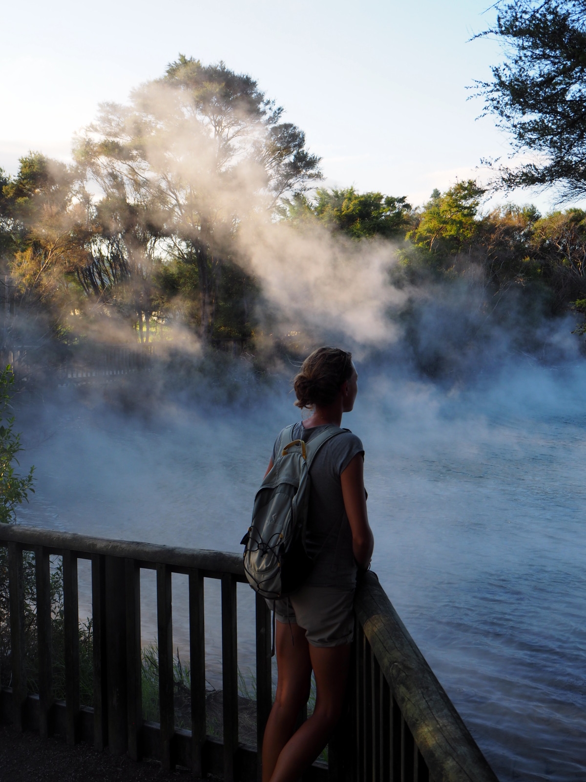 Nous profitons de la fin de journée pour visiter cette ville toute propre mais et assez désertique… Ah non ! il y avait bien des chinois ! ;) Notre aire de campement pour la nuit était juste à côté des « Gouvernment Gardens », un simple parking… Puis direction un parc public où l’on peut voir des sources chaudes et des bassins de boue bouillonnante ! C’est très insolite et surtout mystique avec la lumière tombante…