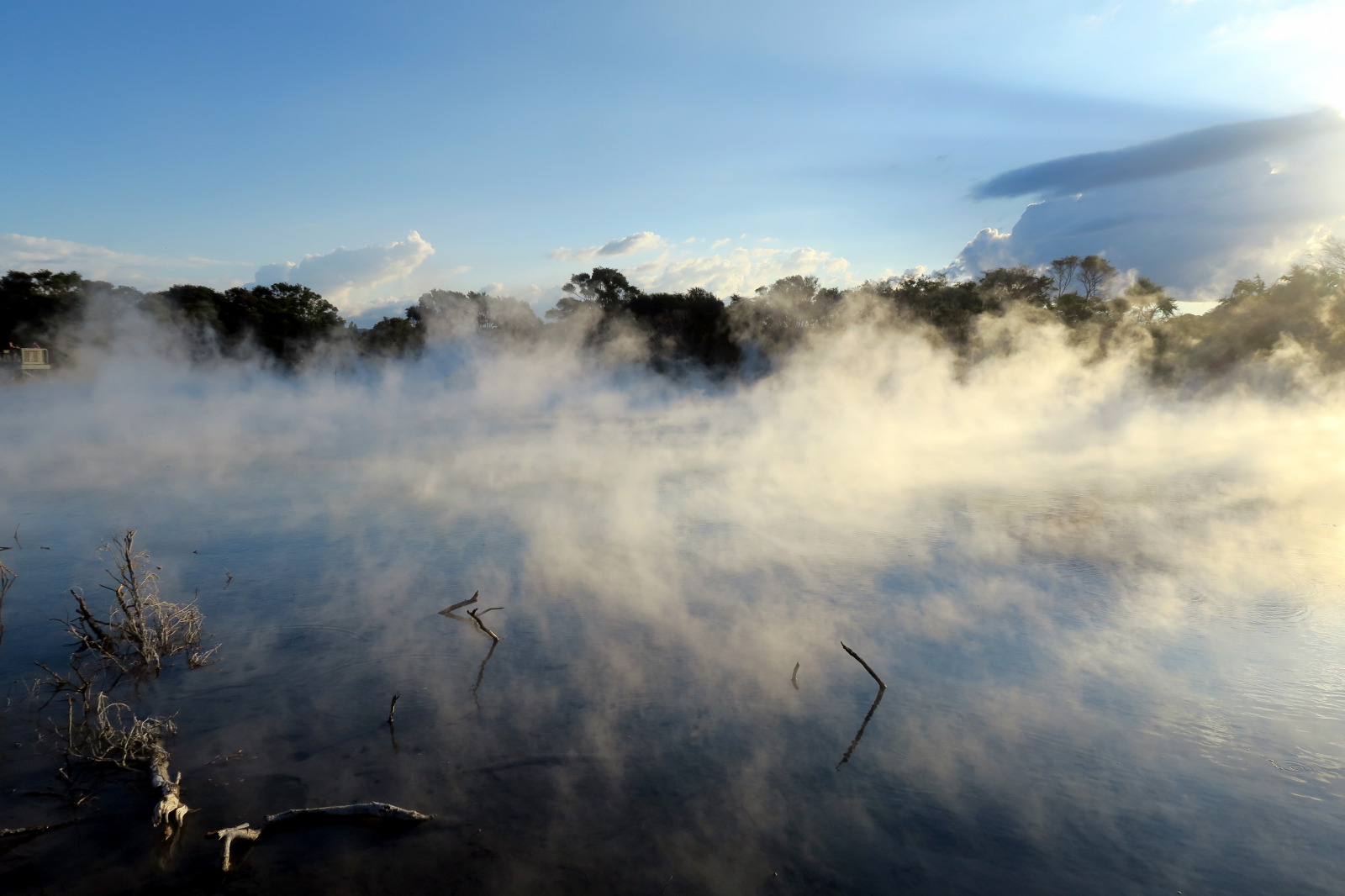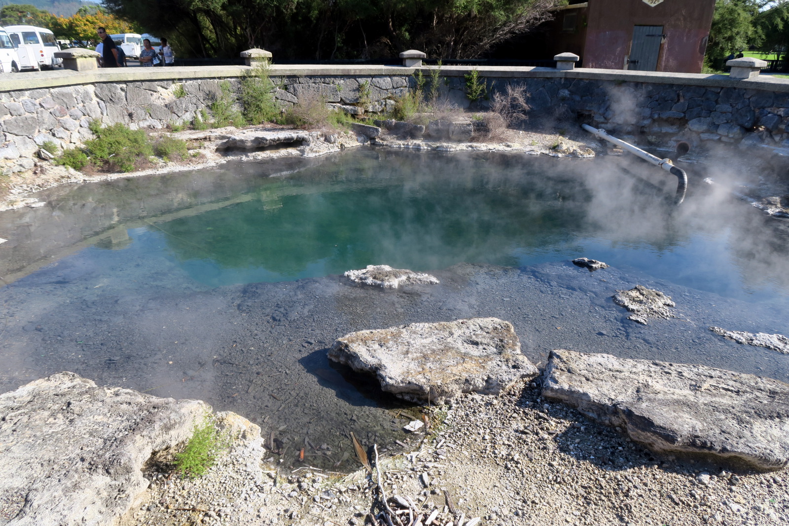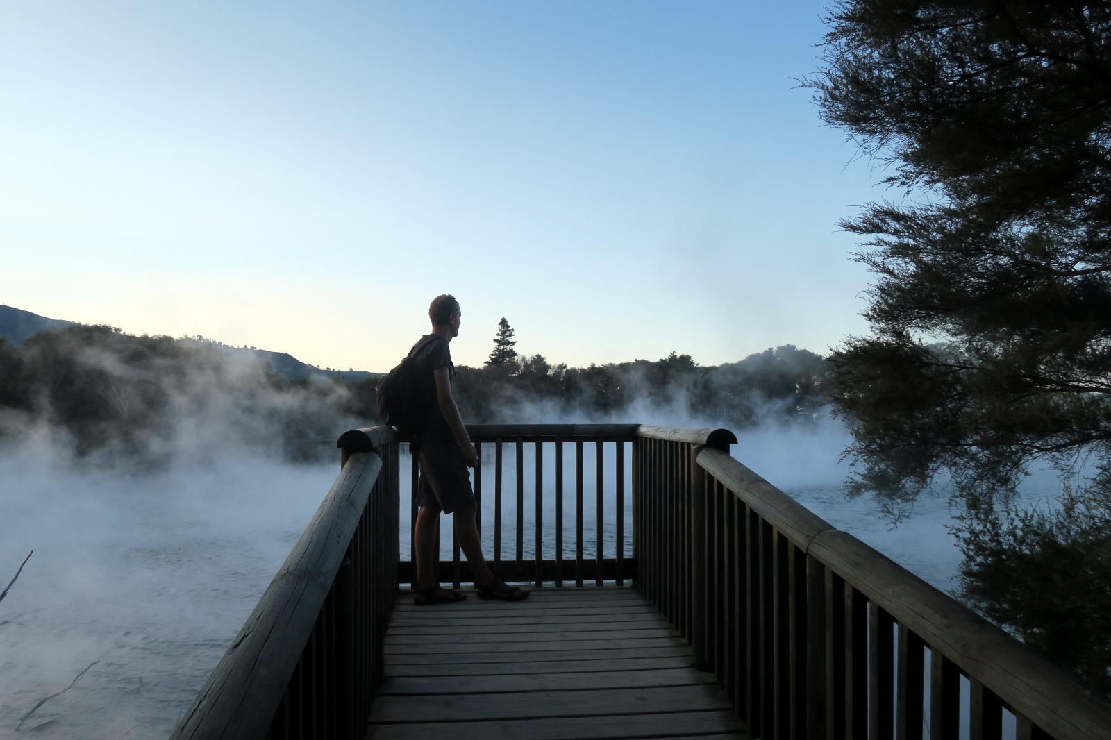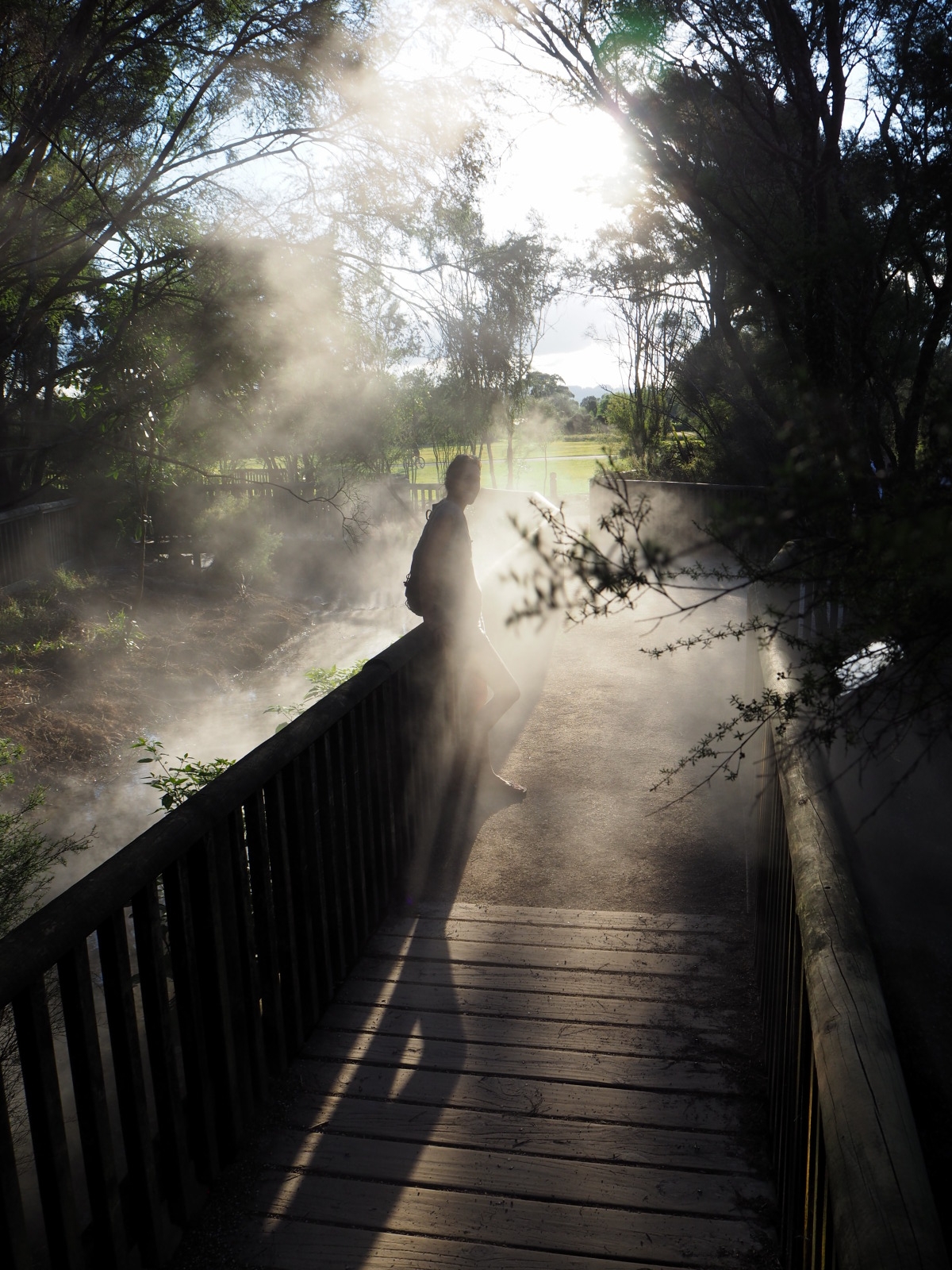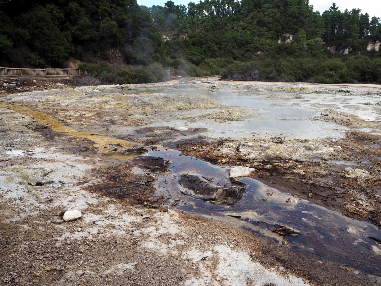 Nous profitons de la fin de journée pour visiter cette ville toute propre mais et assez désertique… Ah non ! il y avait bien des chinois ! ;) Notre aire de campement pour la nuit était juste à côté des « Gouvernment Gardens », un simple parking… Puis direction un parc public où l’on peut voir des sources chaudes et des bassins de boue bouillonnante ! C’est très insolite et surtout mystique avec la lumière tombante…