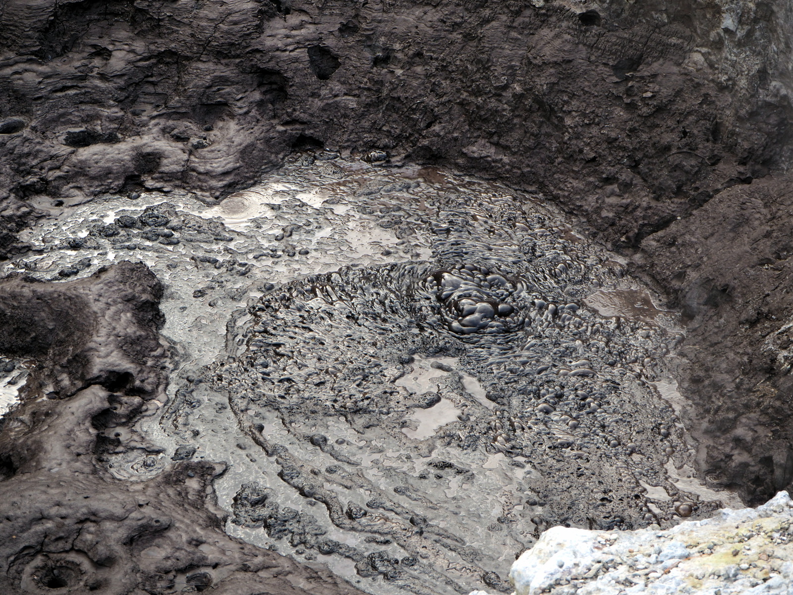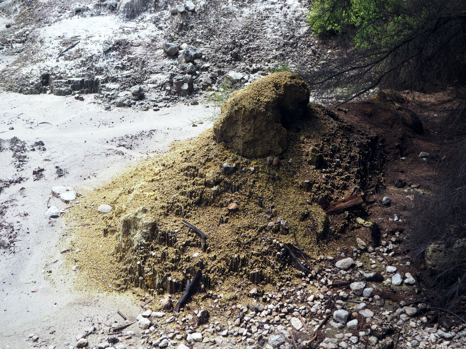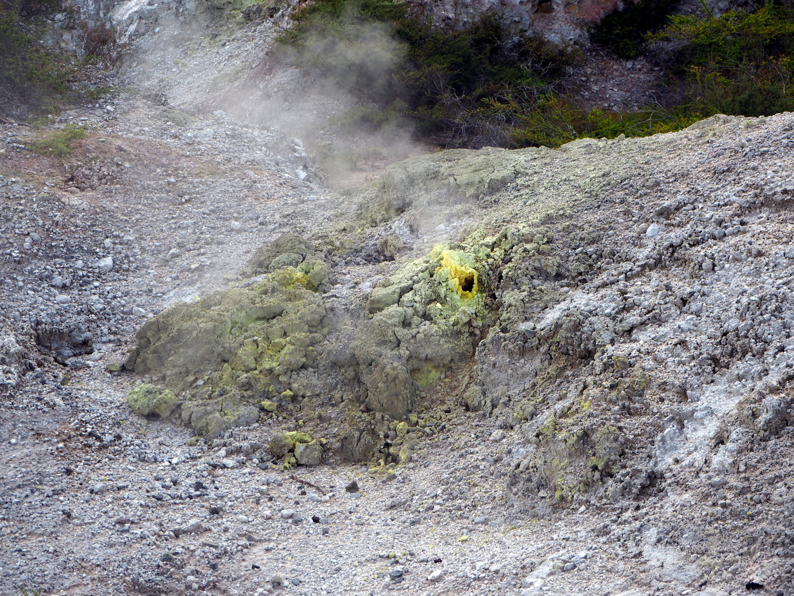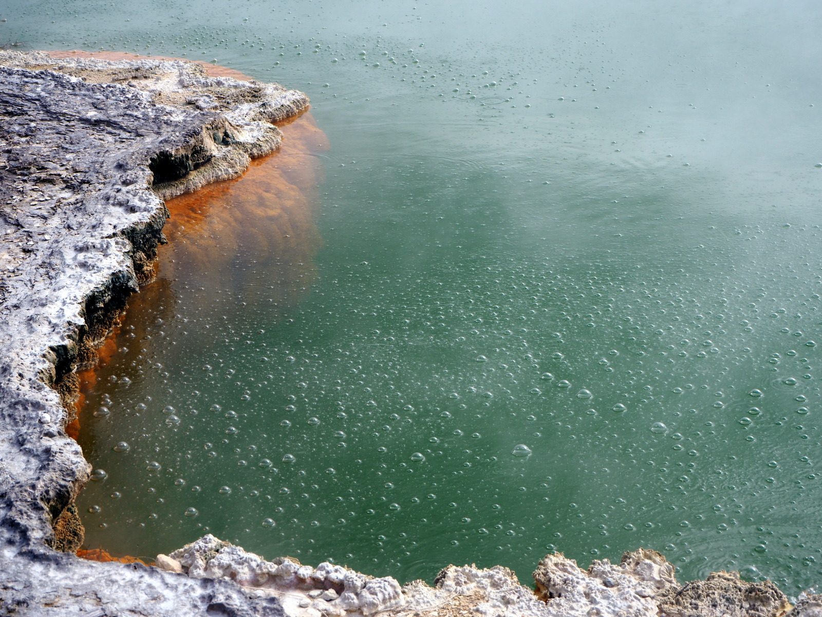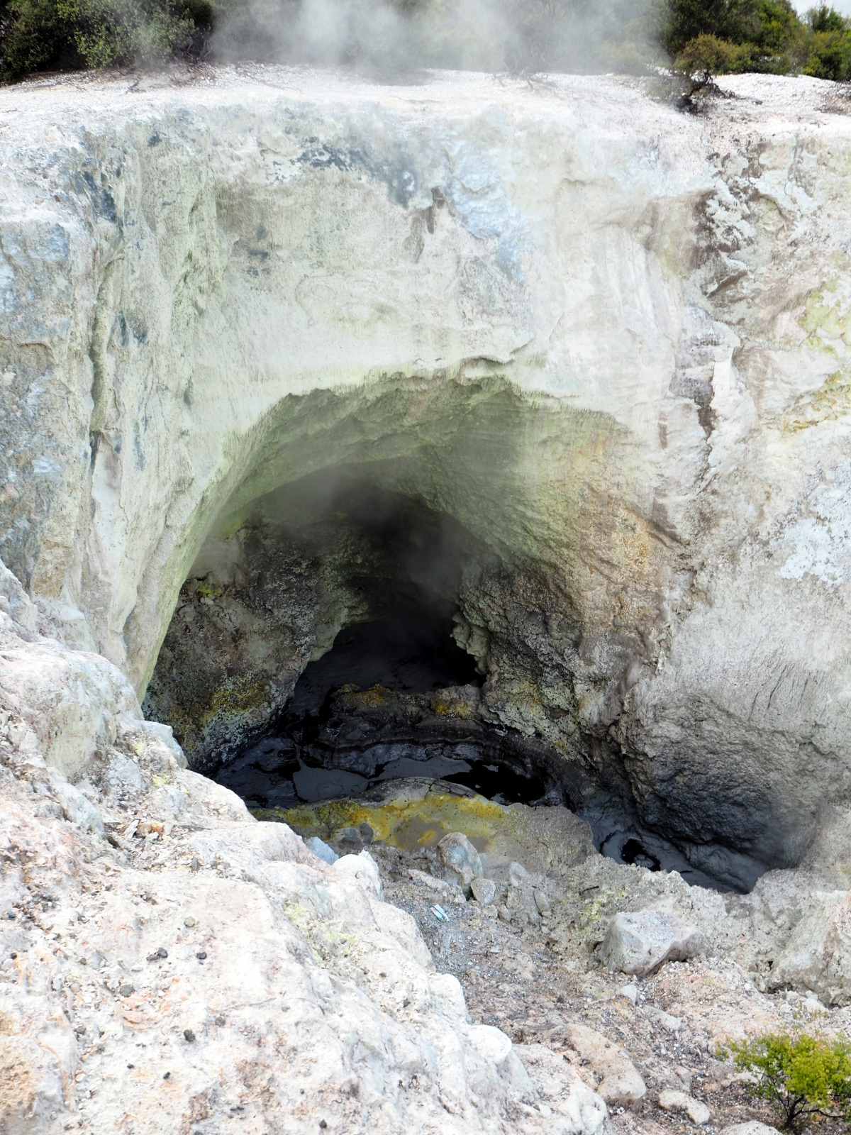 Nous déambulons à travers ces incroyables manifestations de la nature : lac vert, terrasses de silice, grottes de souffre, cratères, piscines de boue bouillonnante, geysers… La plus connue est « la piscine de champagne », une source verdâtre de 70 degrés libérant de petites bulles de dioxyde de carbone et dont les bords sont oranges vifs à cause des dépôts de soufre, arsenic, argent, or, mercure… Impressionnant ! Le « bain du diable » est un grand cratère aux contours déchiquetés qui contient un eau de couleur étonnante : plus l’eau est verte, plus elle contient d’arsenic ! Dingue !