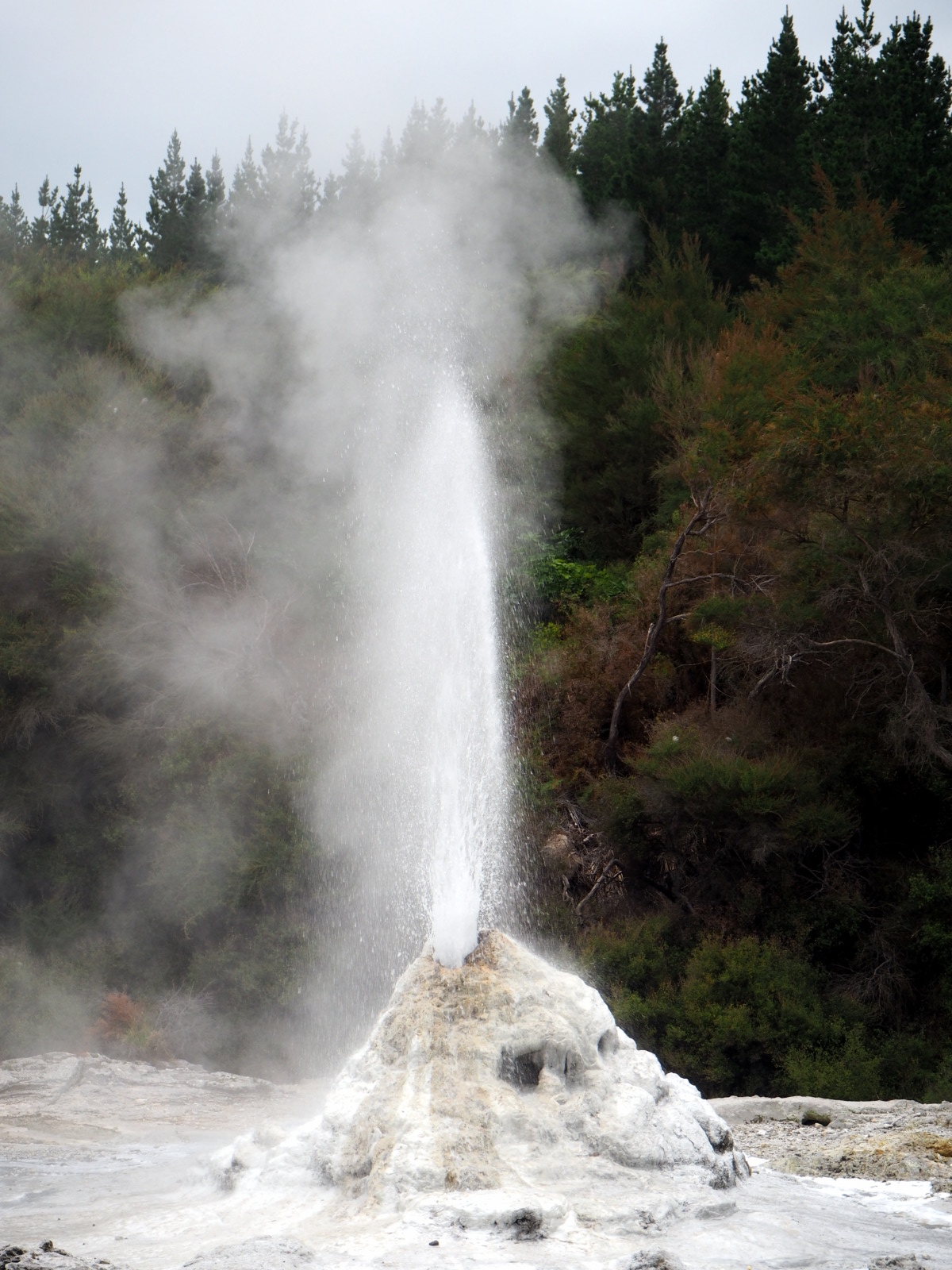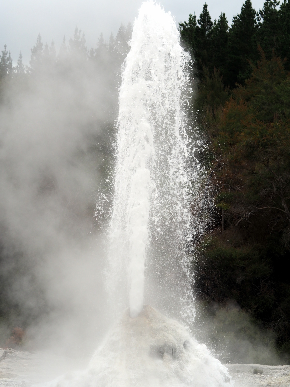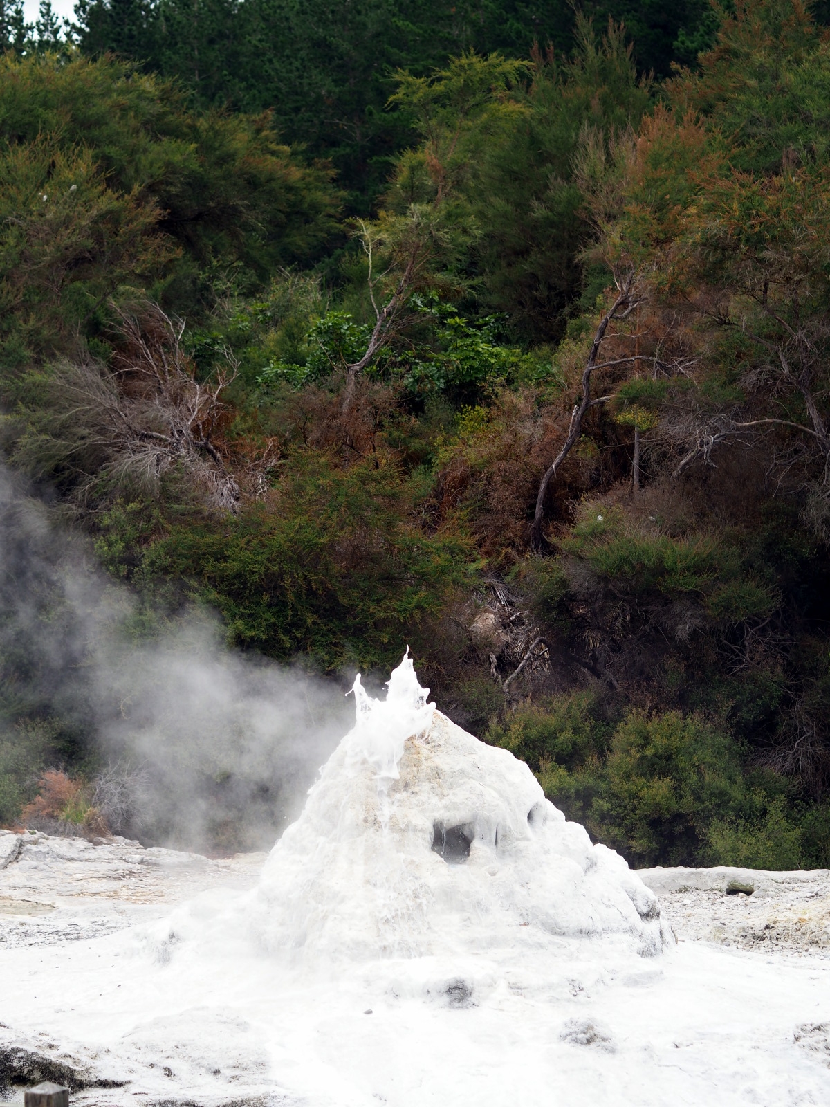 A 10h15, le geyser « Lady knox » s’active. Ce geyser, naturel à la base, est « activé » pour les touristes à heure tapante, en mettant dans la bouche du cratère un composant chimique (à l’origine du savon, désormais un tensioactif biodégradable) qui vient rompre la tension superficielle de l’eau, ce qui fait « monter la mayo » ;) Le geyser crache alors durant plusieurs dizaines de minute.
