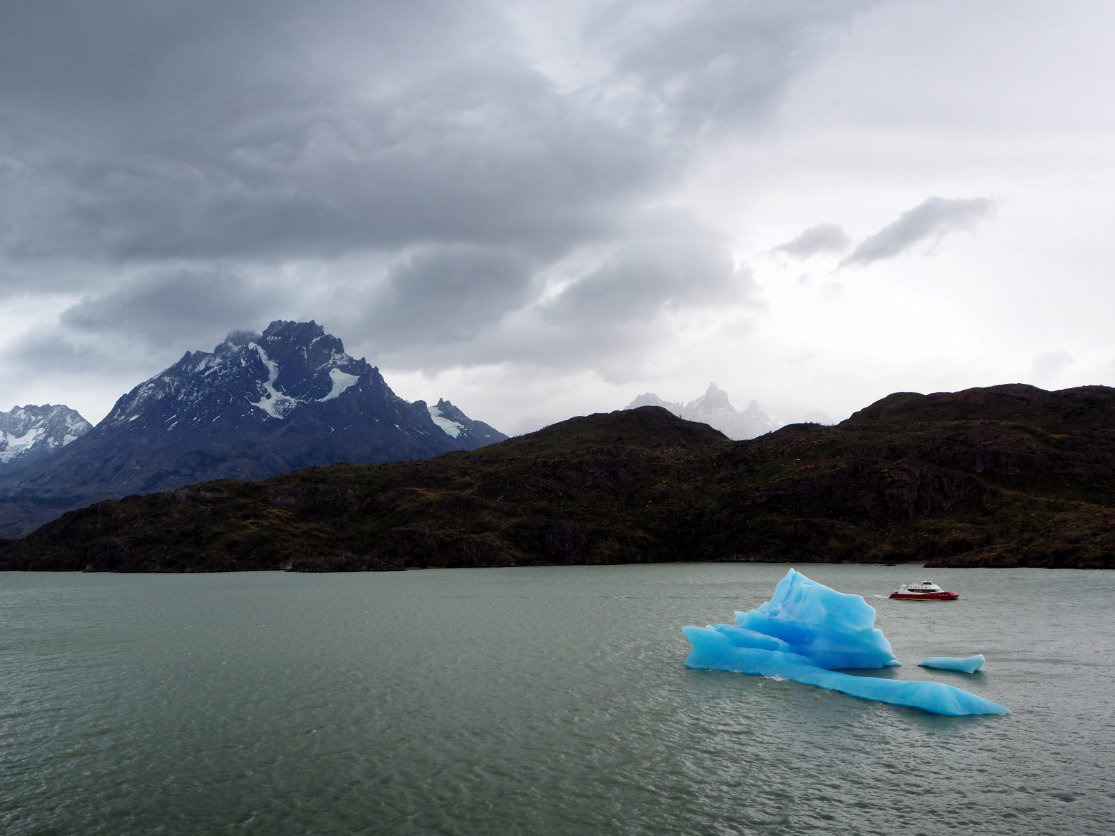 Il est 12h, on descend « enfin » du bus pour se dégourdir les jambes ! Certaines personnes du bus ont un déjeuné inclus dans leur tour. De notre côte, on saute sur l’occasion pour s’échapper et faire une petite rando de 1h30 pour voir le glacier Grey de loin, ainsi qu’un énorme iceberg tout bleu flottant dans le lac ! Les conditions météo n’étaient pas vraiment de notre côté et c’est sous le vent et la pluie que nous avons randonné. On a un peu mieux compris les mises en garde contre le temps en Patagonie…