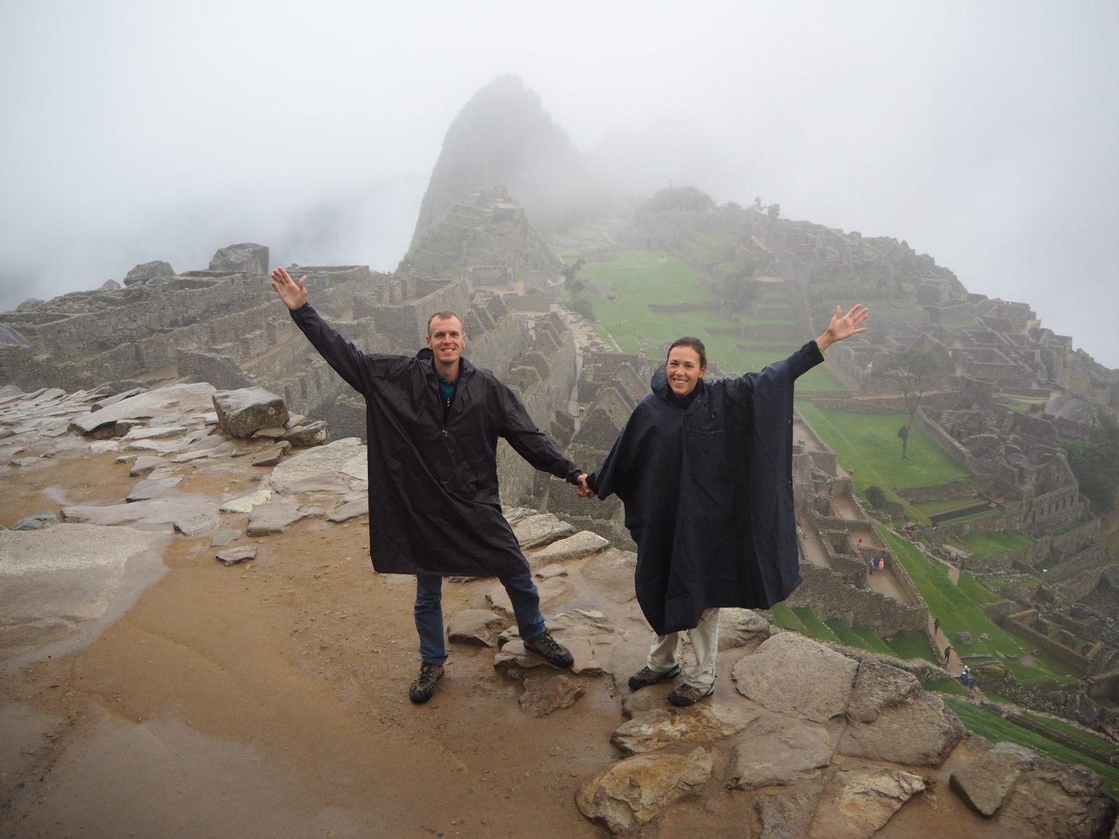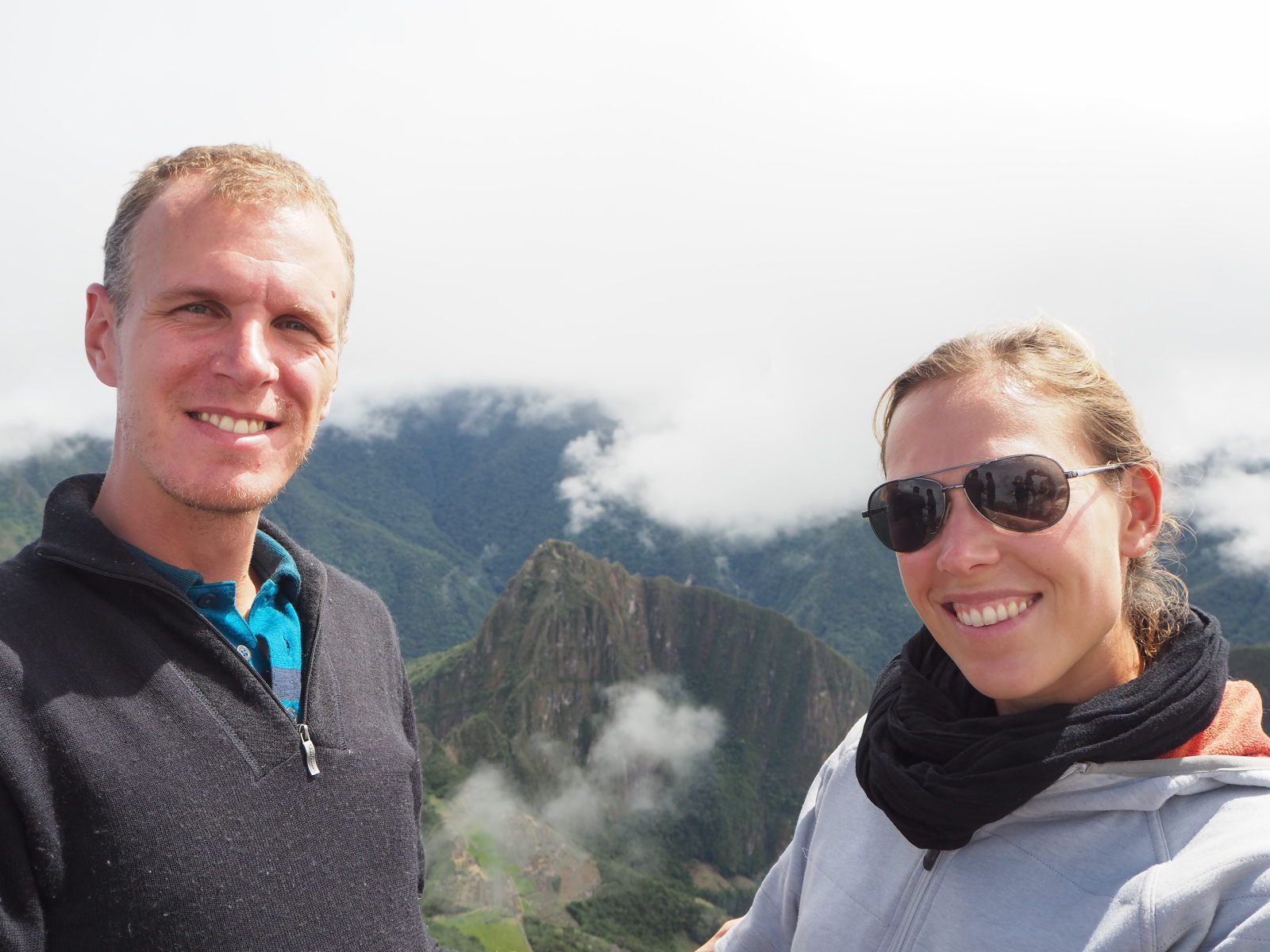 A 8h40 nous étions en haut, avec aucune visibilité sur le Machu Picchu. Grosse déception donc mais nous décidons d’attendre (avec les autres touristes présents) que les nuages veuillent bien se lever. Et puis de temps en temps, une trouée rapide dans les nuages permet d’apercevoir le site ! Tout le monde sort alors son appareil photo, chacun tente d’avoir son selfie ! Entre temps, Elise a pu assister à une demande en mariage à 30cm d’elle, mignon mais un peu gênant toutefois.
