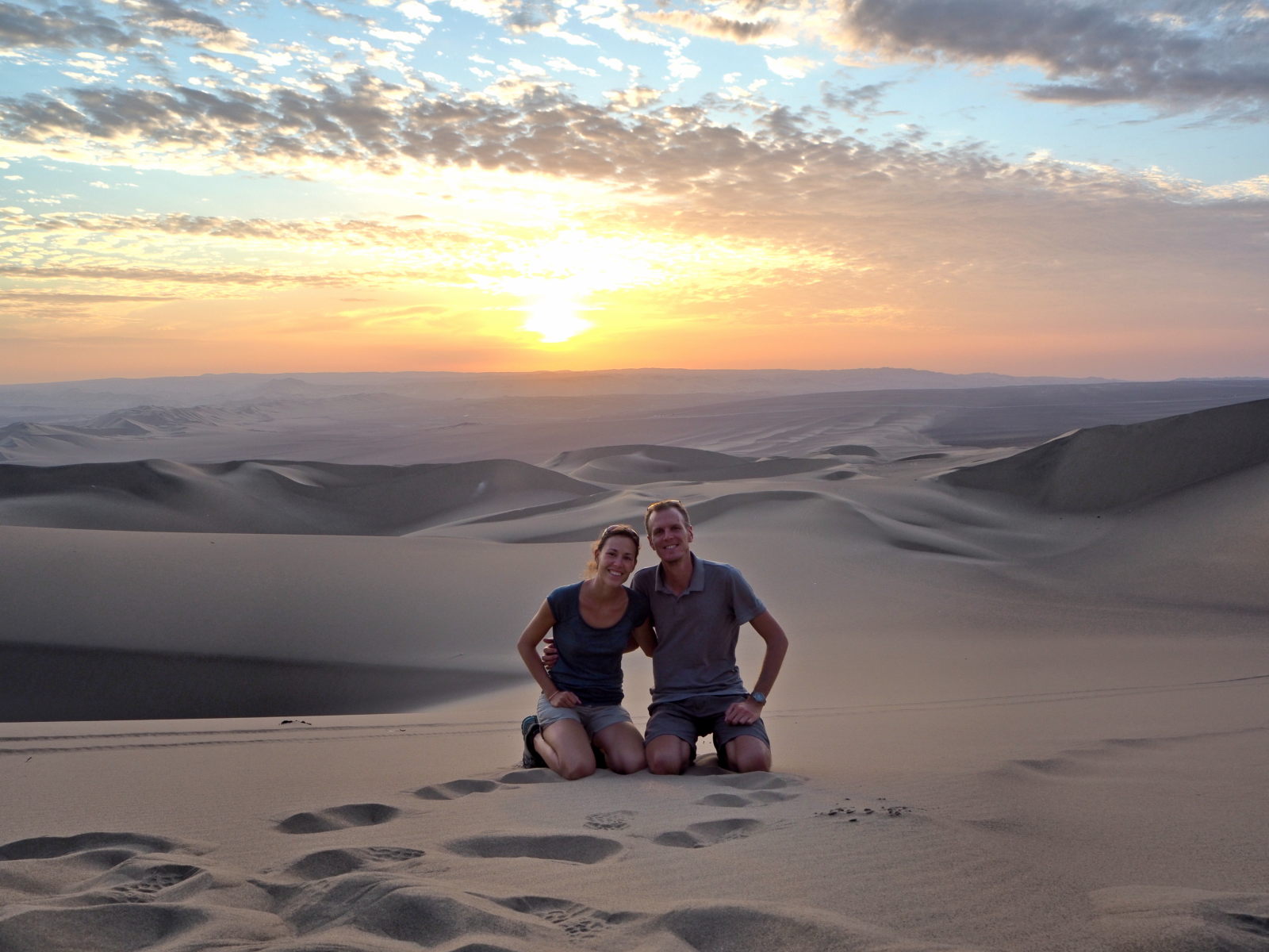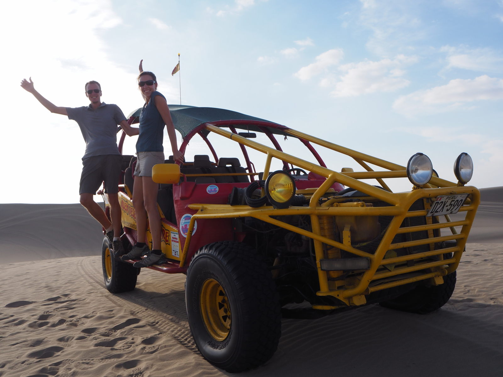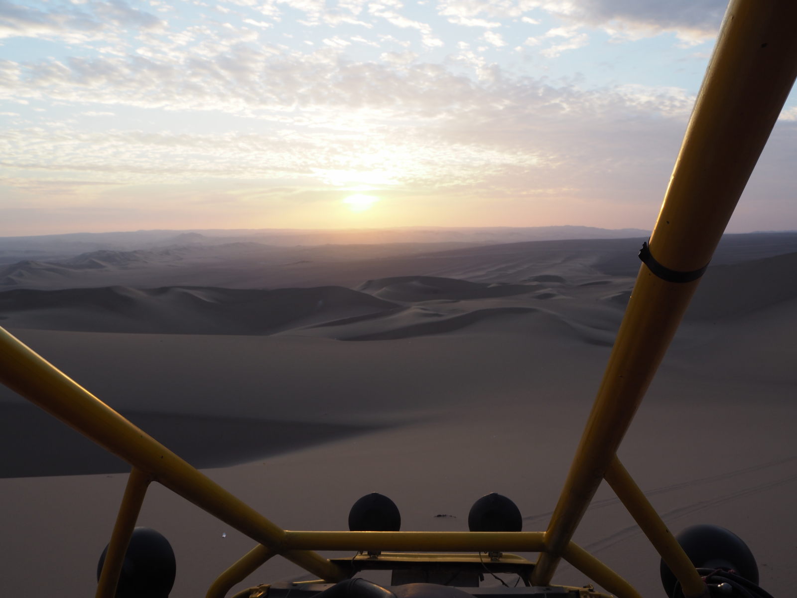 Nous avons testé le buggy et le sandboard (45 Sol pour 2 heures), avec départ en fin de journée pour assister au coucher du soleil. Et c’était génial ! Sensations fortes garanties… Les dunes sont tellement hautes que quand le buggy les redescendait, nous avions l’impression d’être dans un manège à la foire, avec les tripes et le cœur qui se soulèvent…