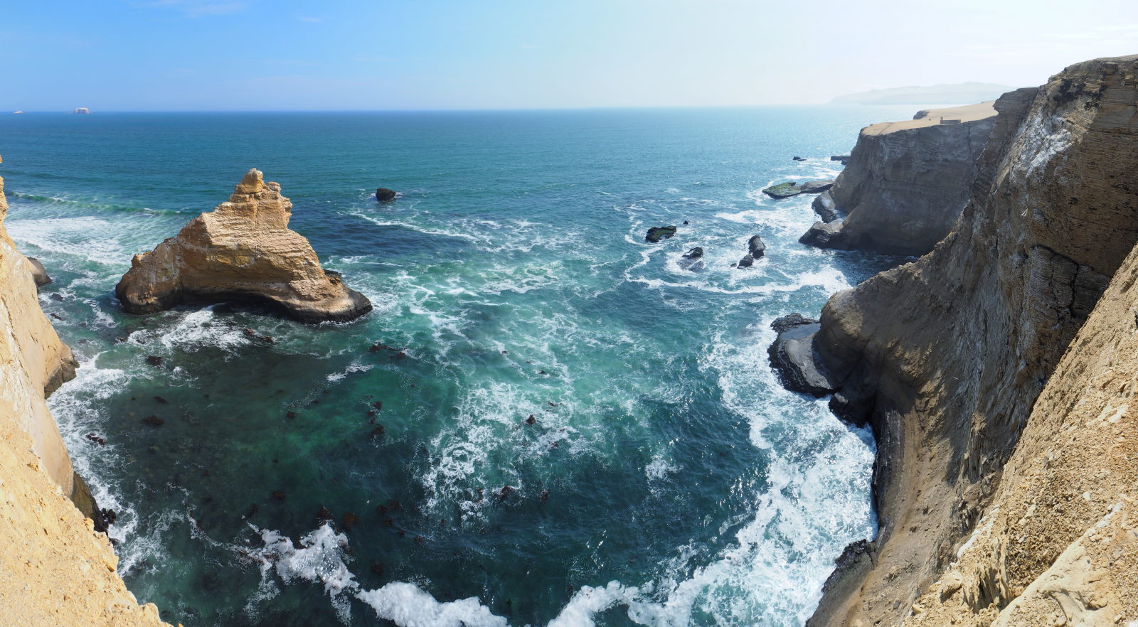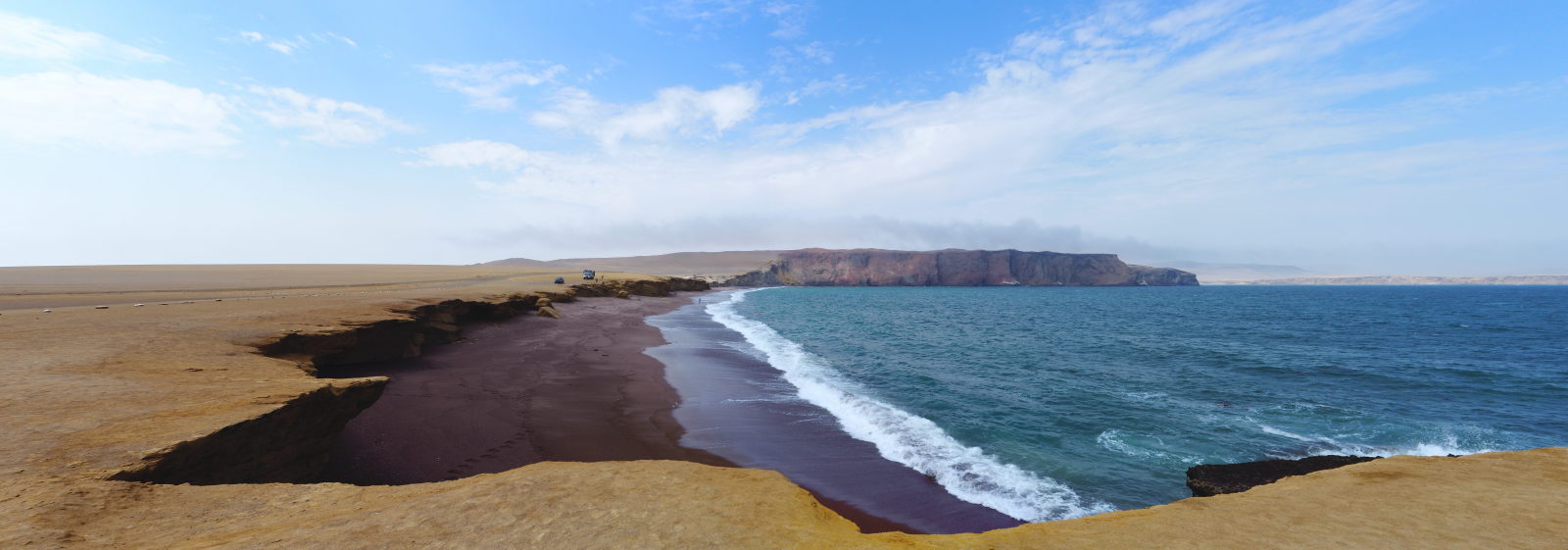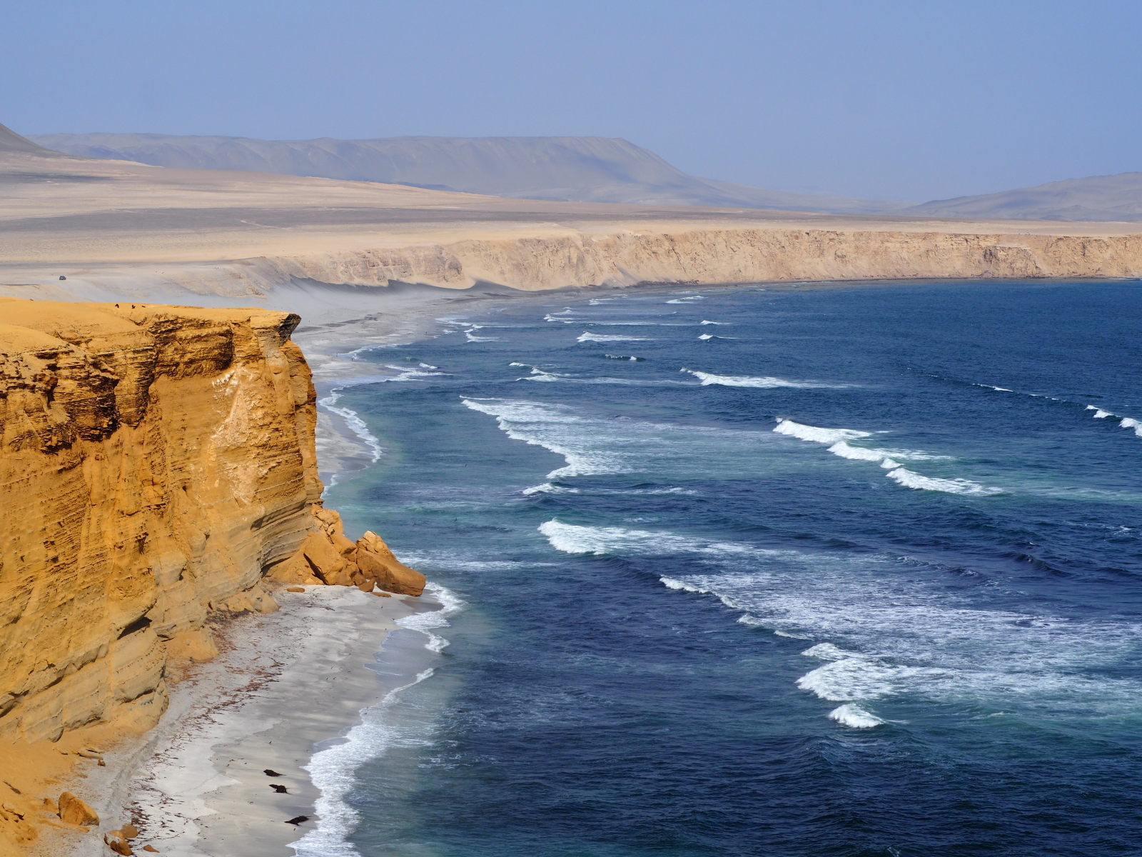 La réserve nationale de Paracas est une zone protégée depuis 1975 et s’étendant sur 335 000 ha (terre et mer). La réserve dispose de superbes plages (mais pas pour la baignade) et de bords de mer abrupts aux couleurs jaune-brun-ocre, lié à l’activité volcanique de la région. Ce contraste est vraiment étonnant. Et si vous vous demandez comment un désert peut se trouver « en bord de plage » : les courants froids génèrent peu d’évaporation, du coup il ne pleut pas et rien ne pousse. Ajoutez à cela des vents constants qui balayent tout…