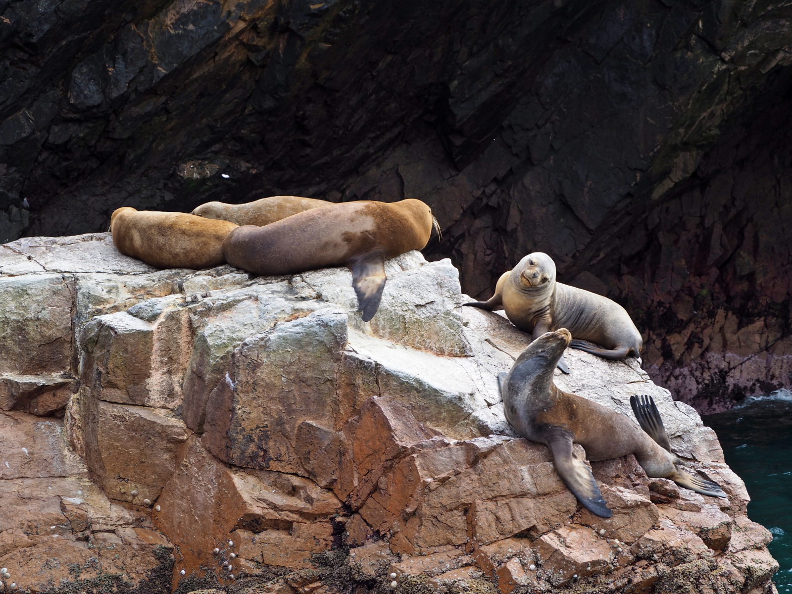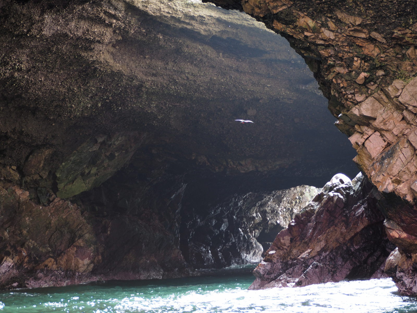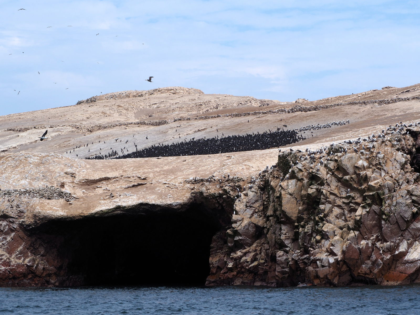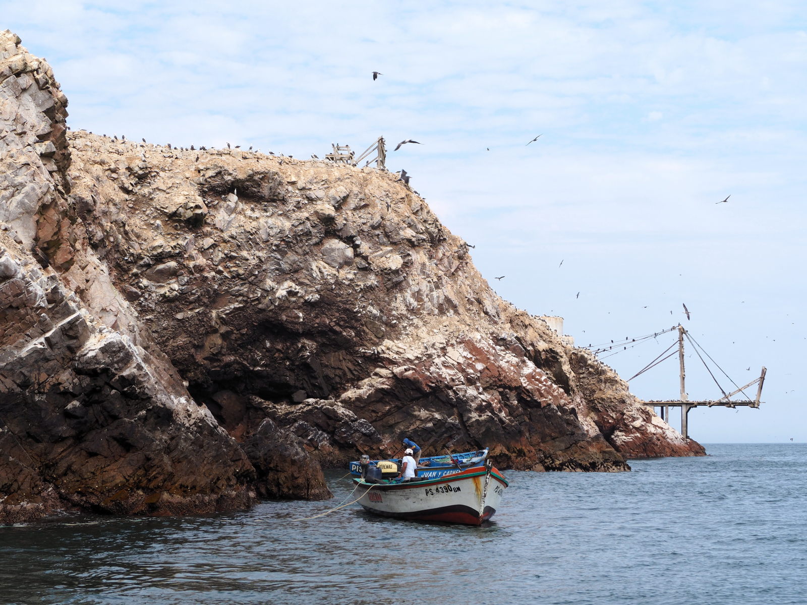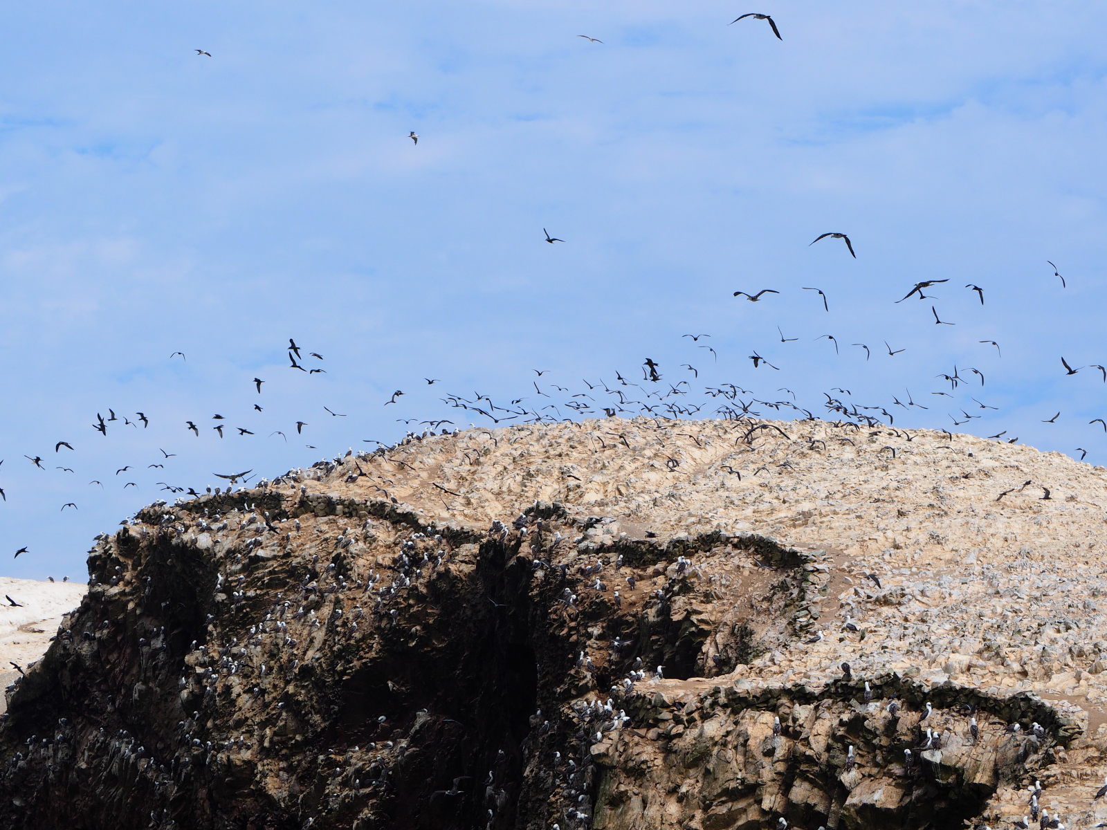 Arrivée aux îles, le spectacle est magnifique. Des oiseaux partout, sur les falaises et au dessus de nos têtes. Des milliers d’oiseaux ! Et du guano à tout va, d’ailleurs certaines personnes de notre bateau en fait les frais. Pas nous ouf ! :) Et on peut vous dire que l’odeur est bien là !