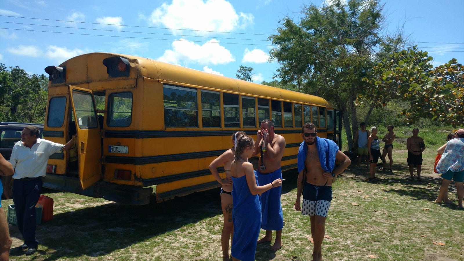 Les activités ne se faisant que sur la première partie de la journée, c’est au petit matin qu’un bus scolaire est venu nous récupérer pour nous diriger vers un hangar et récupérer notre matériel à l’ « école de plongée ». Nous partons ensuite en direction de la Cueva de los Peces. En effet, les belles plages et les beaux endroits pour plonger ne sont pas à Playa Larga même, mais entre Playa Larga et Playa Giron (voir la carte ci-dessous). C’est parti pour une demi journée dans l’eau tiède de Cuba !