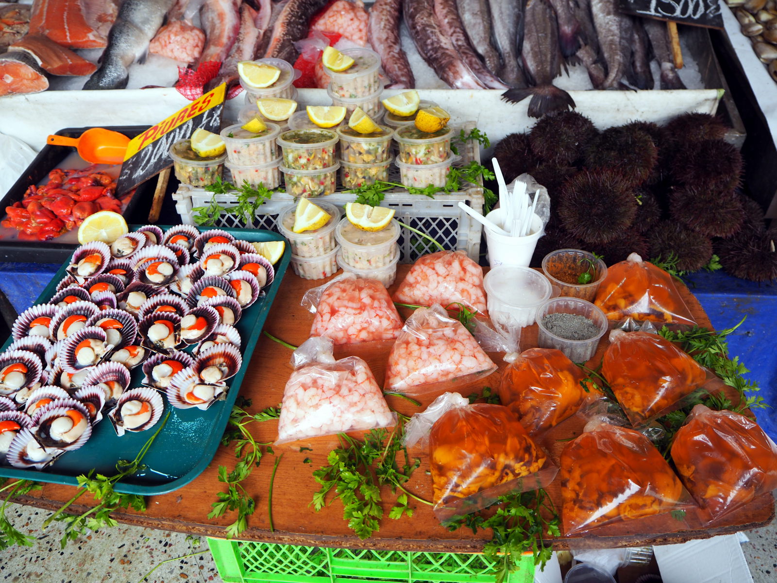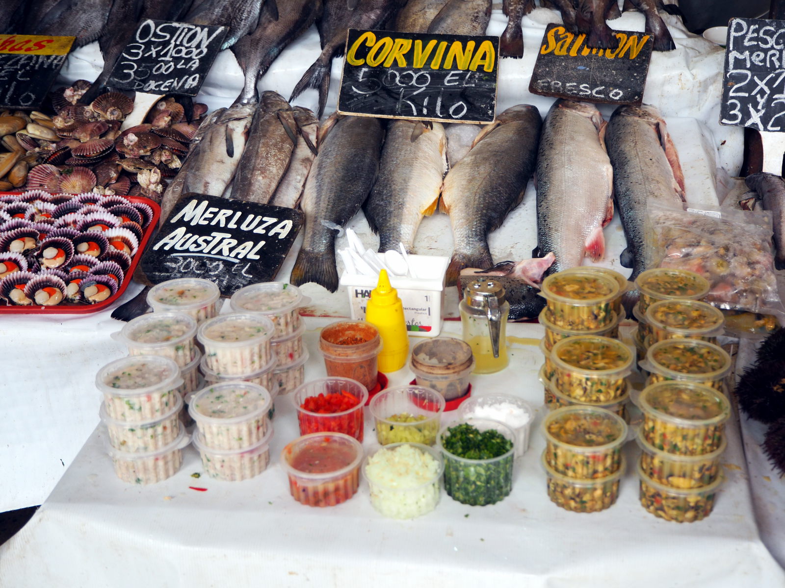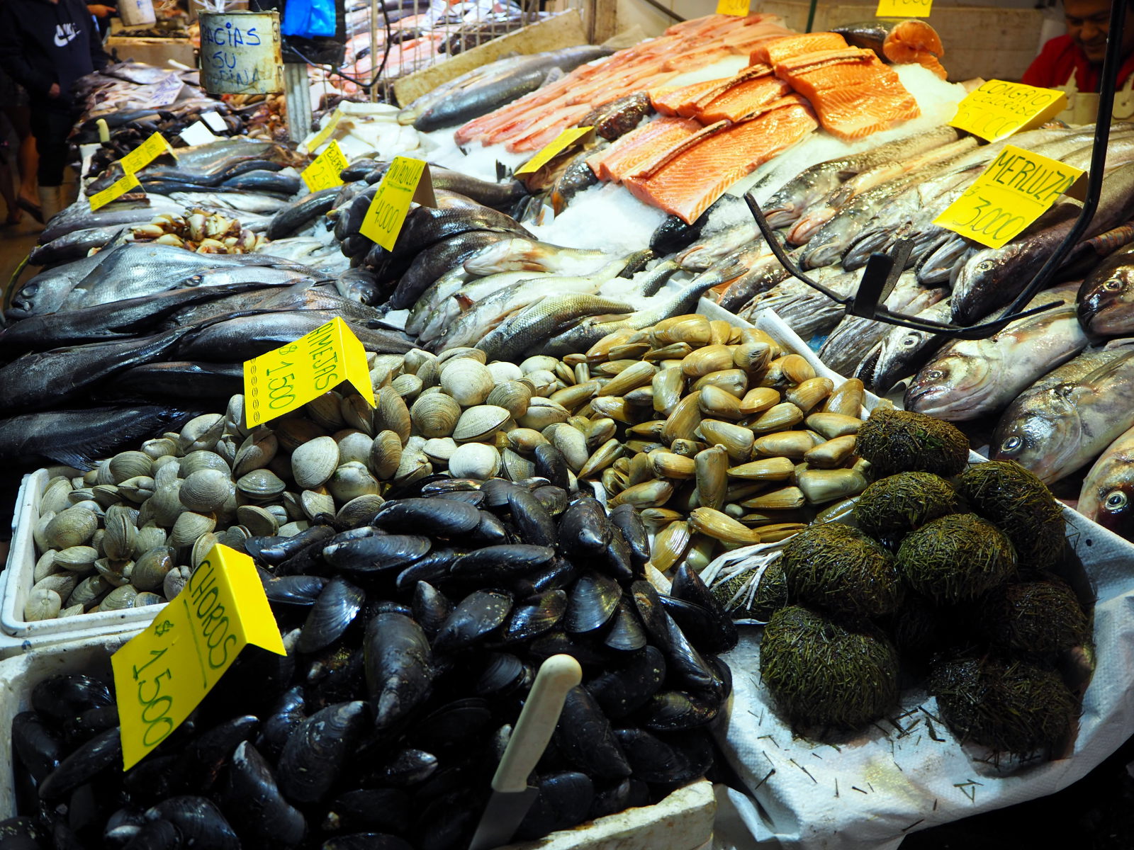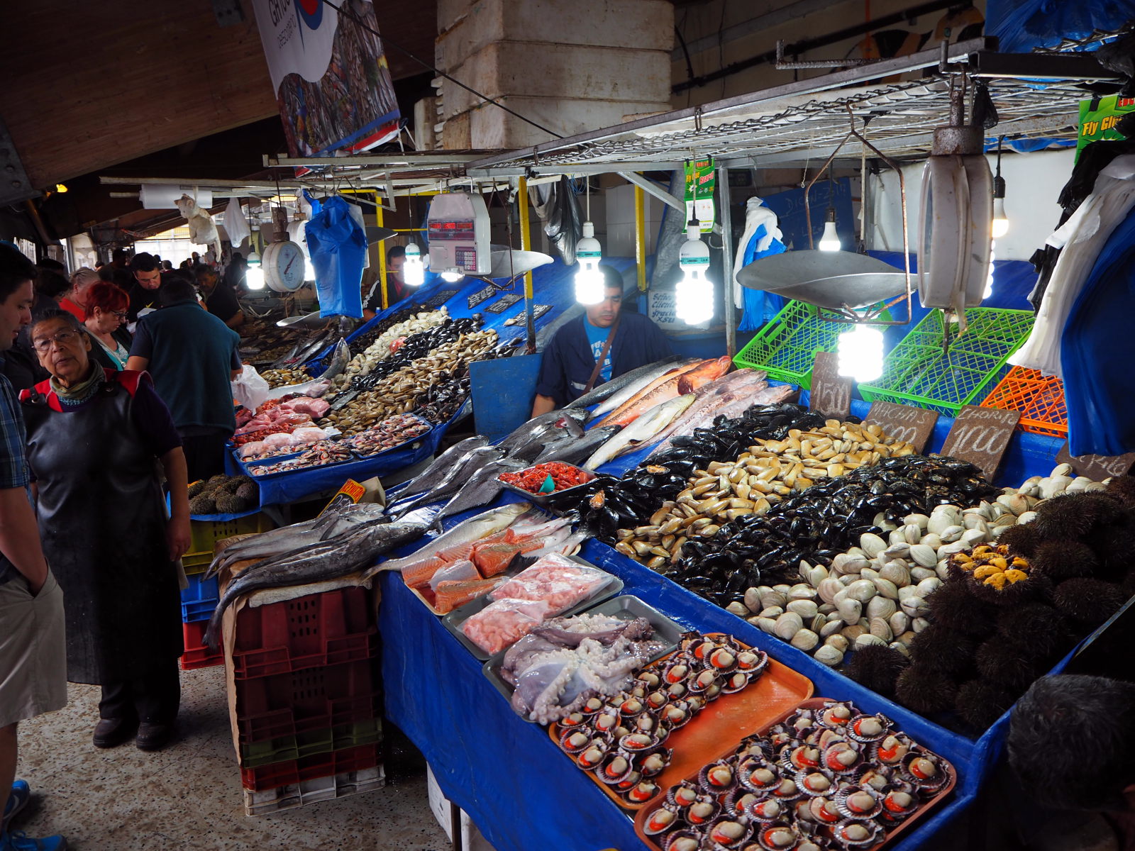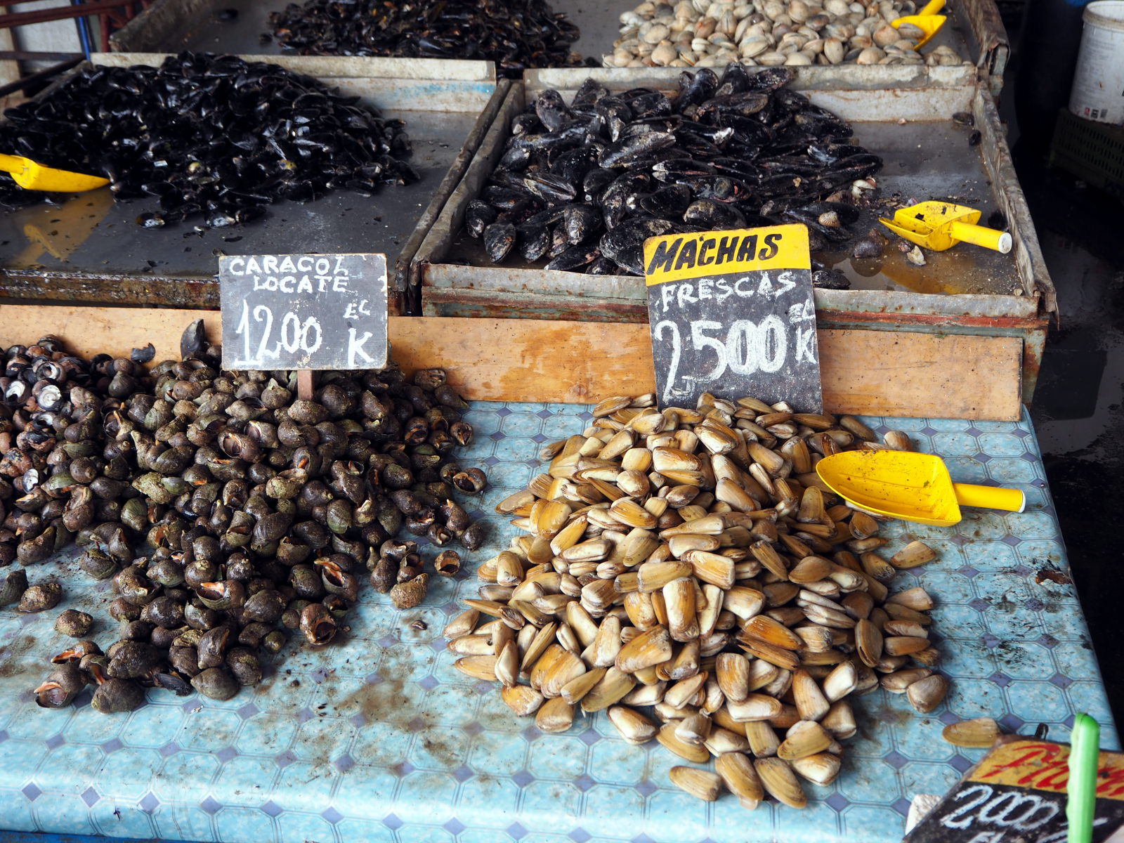 A la criée de Valparaiso, divers coquillages et fruits de mer en vente