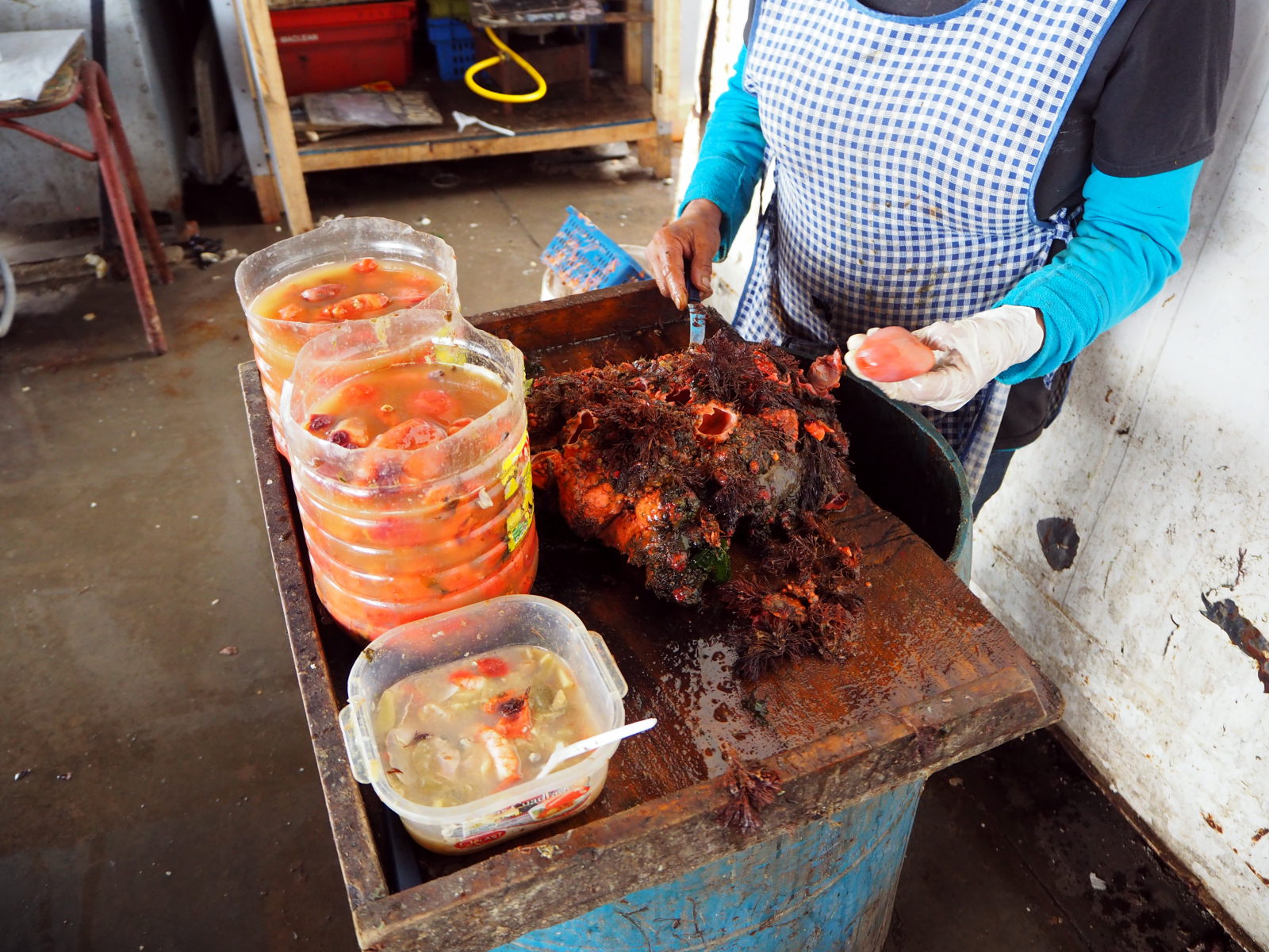 Voici des Pyura chilensis, une espèce d’ascidie comestible des côtes du Chili et du Pérou, dont le nom vernaculaire espagnol est piure. C’est rouge, visceux, ça sort d’un gros coquillage moche et c’est pas très appétissant