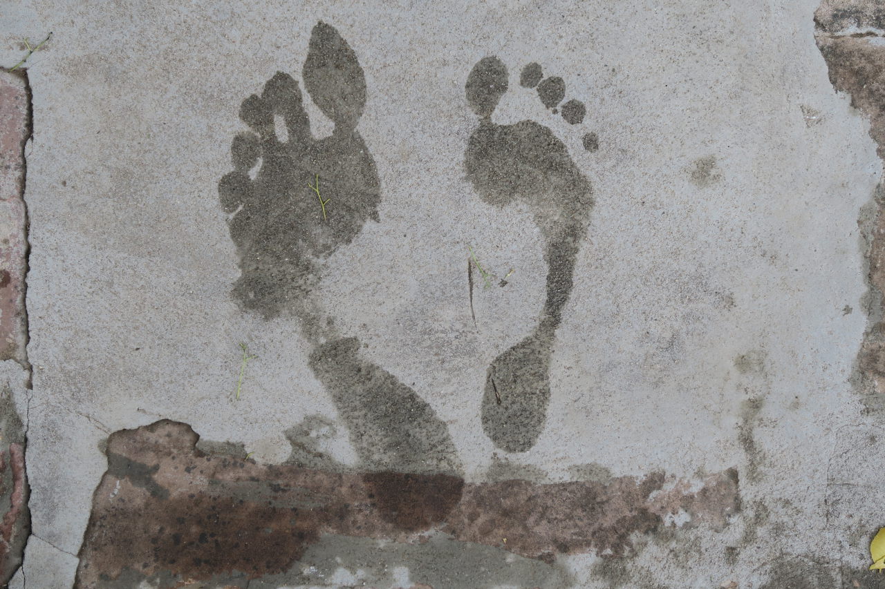 Les semelles de boue sous les chaussures de Julien