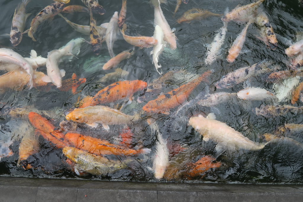 Bassin avec d’énormes carpes Koï – habituées à être nourries par les touristes, elles rappliquent dès qu’on s’approche du bord