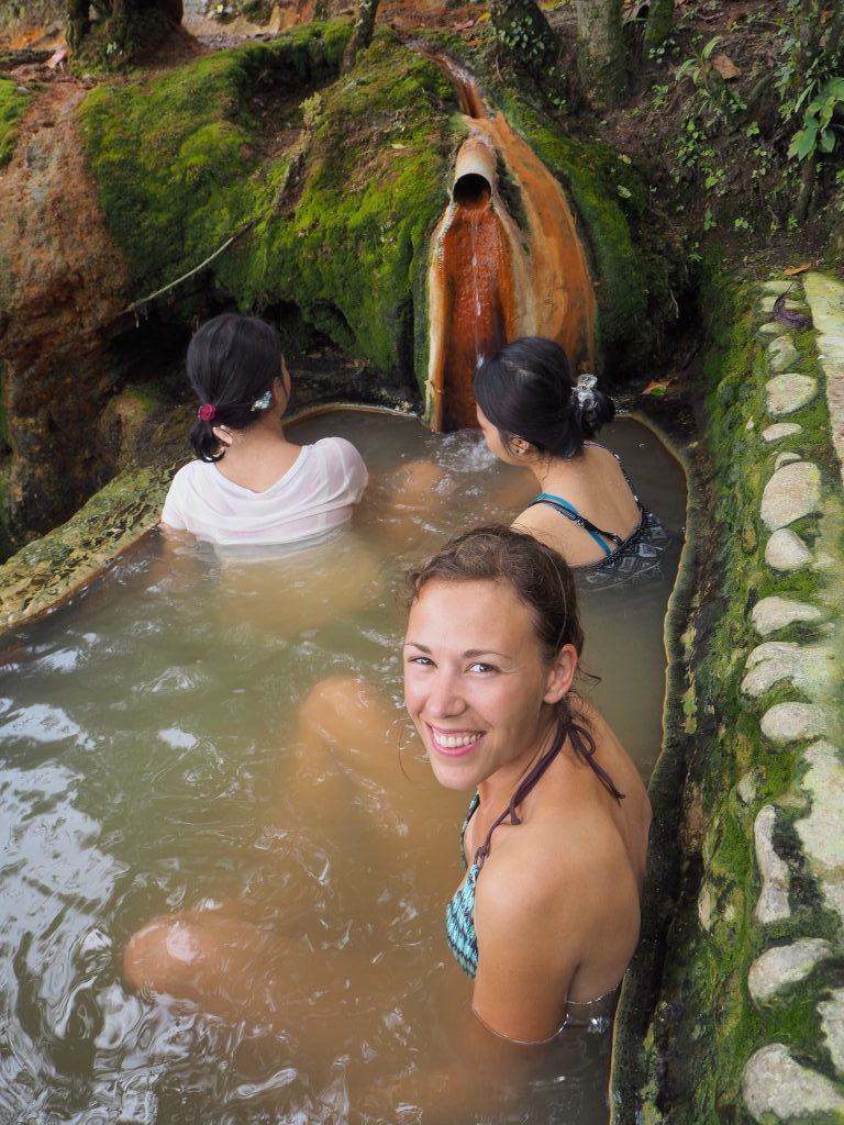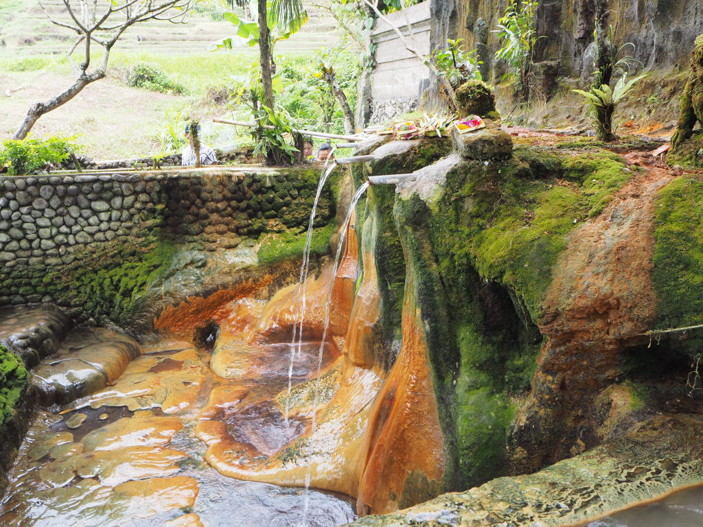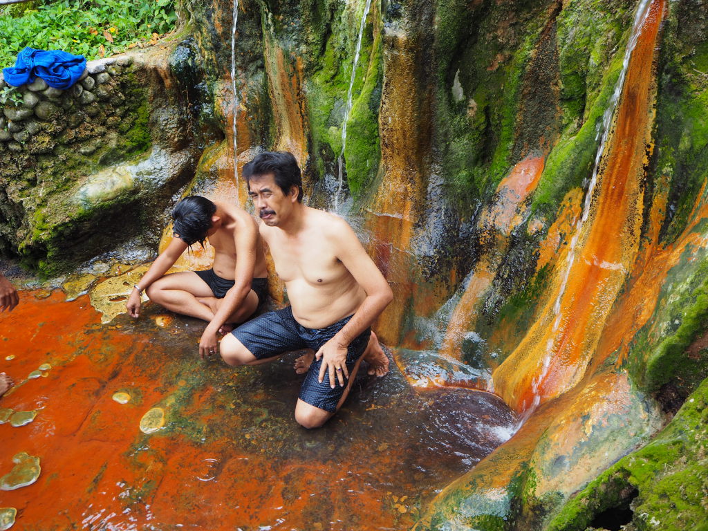 Des locaux sous les douches chaudes des sources de Belulang. Le souffre et le fer présents dans l’eau laissent les couleurs visibles sur les murs