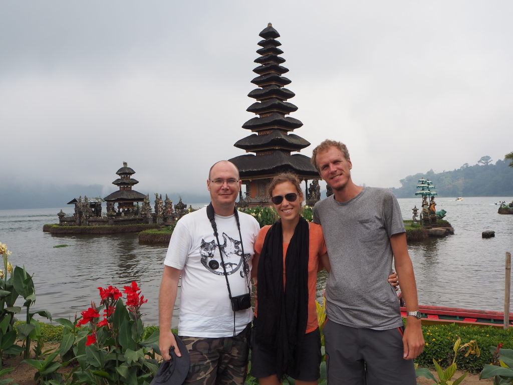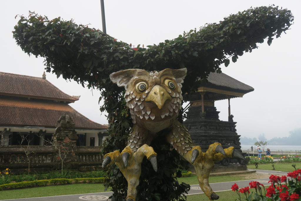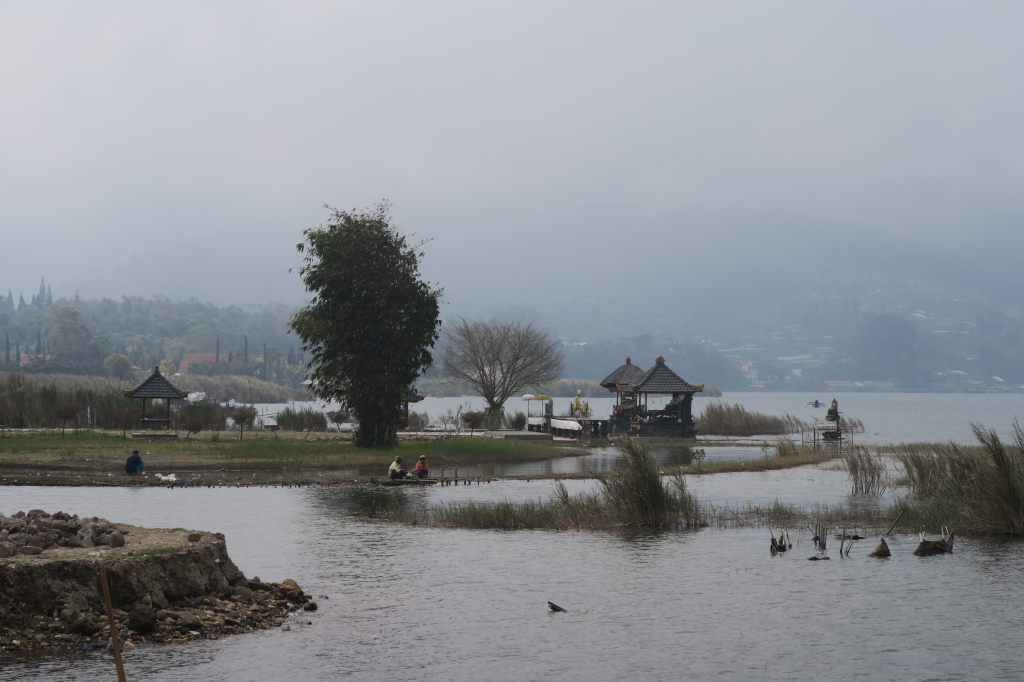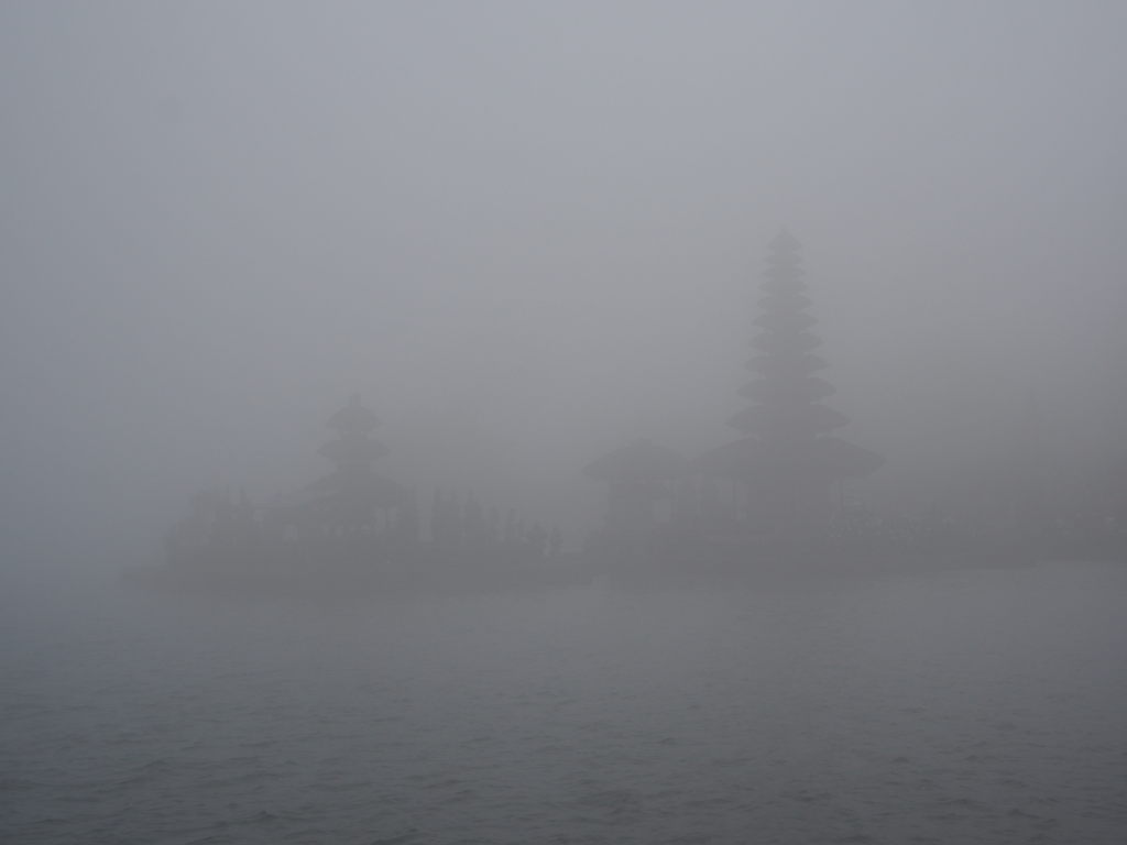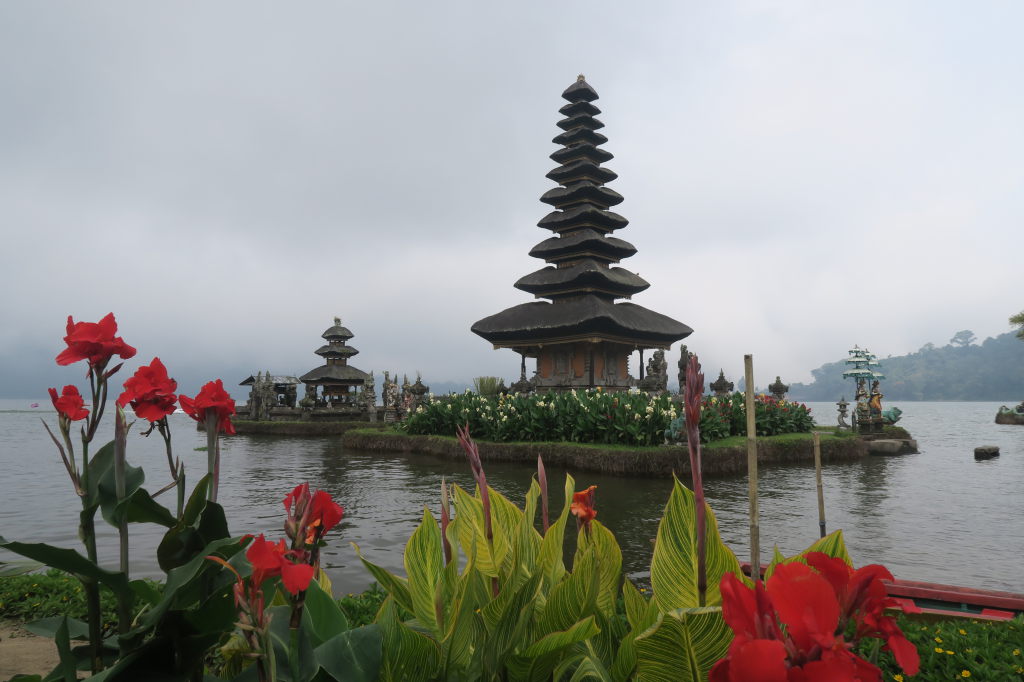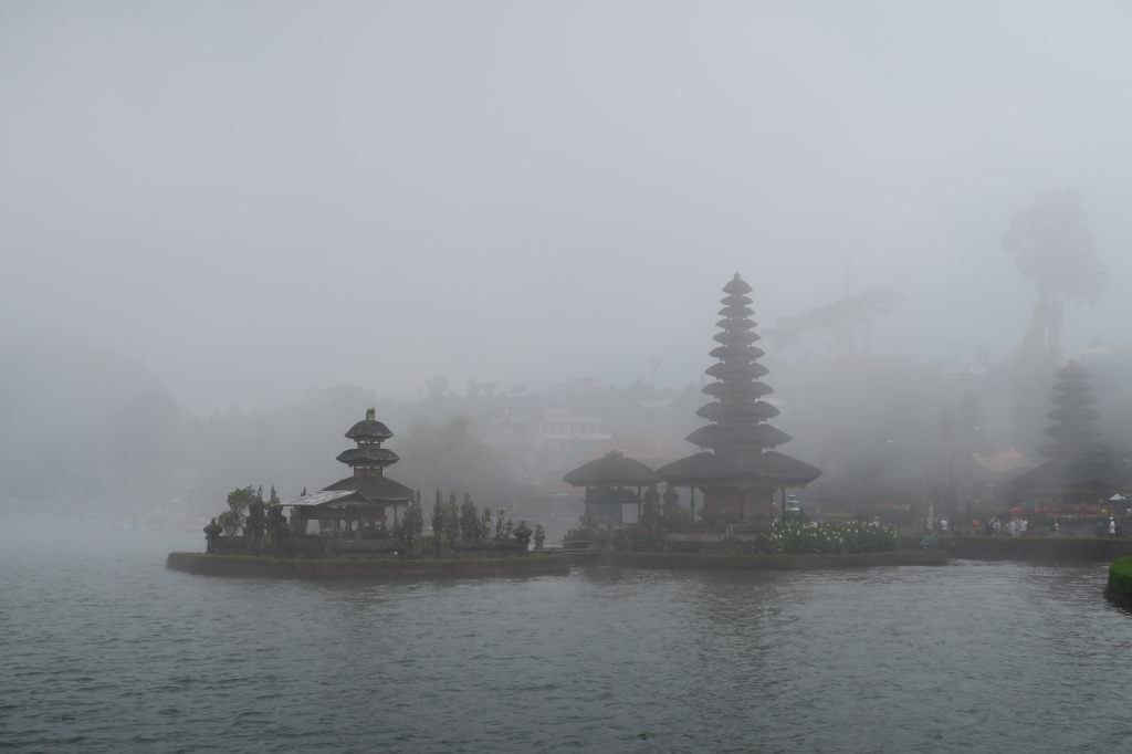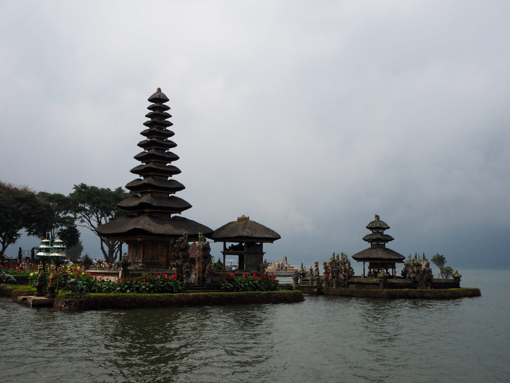 Les tours (« meru ») du temple de Ulun Danu Bratan. Les pieds immergés dans l’eau du lac, ces meru comportent un nombre différent de toits (toujours impair), selon l’importance du dieux concerné. Le maximum est 11 toits.