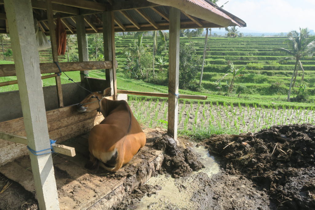Les vaches servant à préparer la terre sont gardées dans des cabanes à l’intérieur des rizières