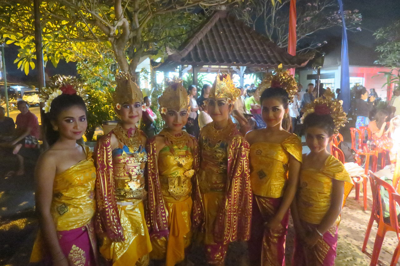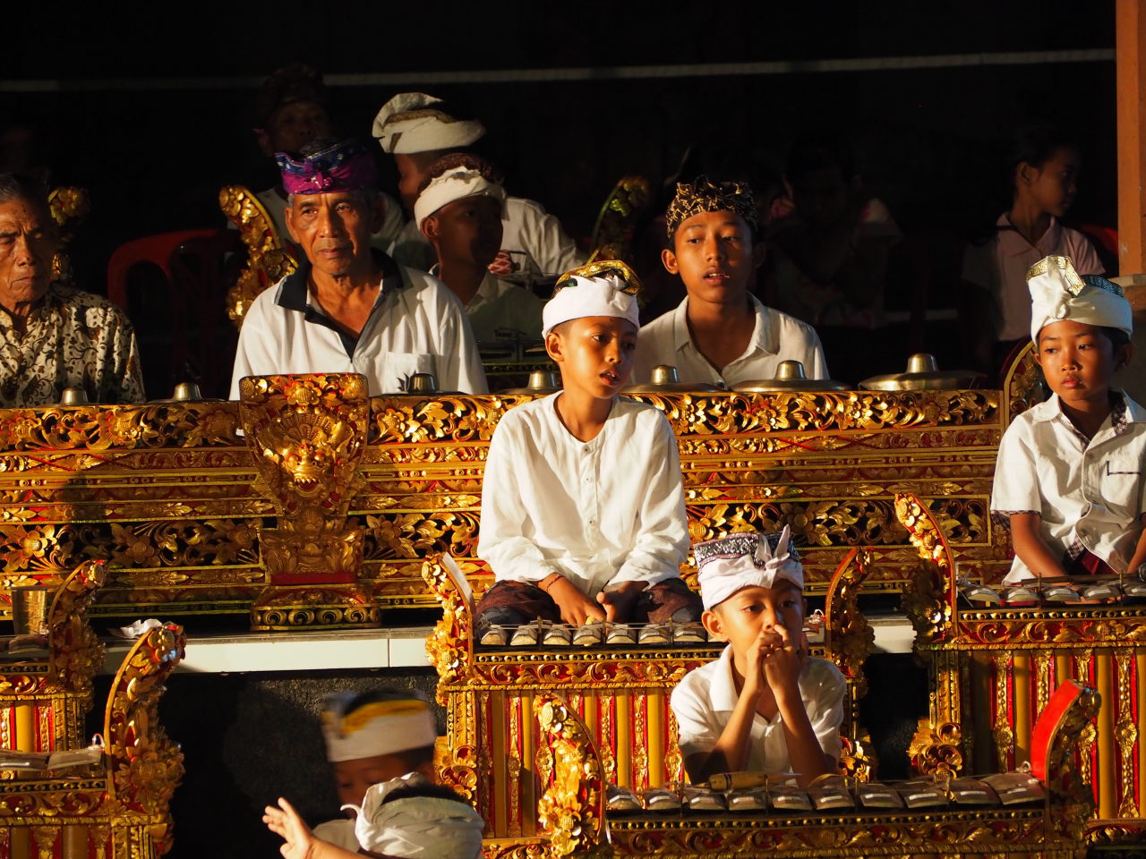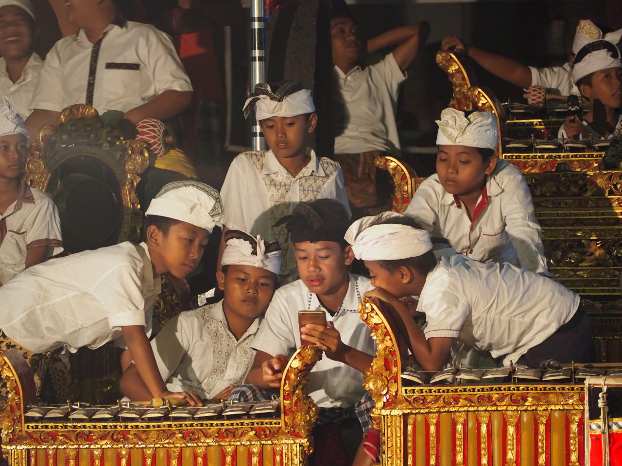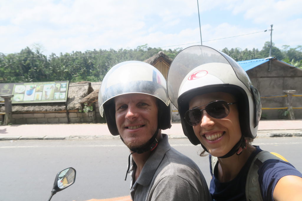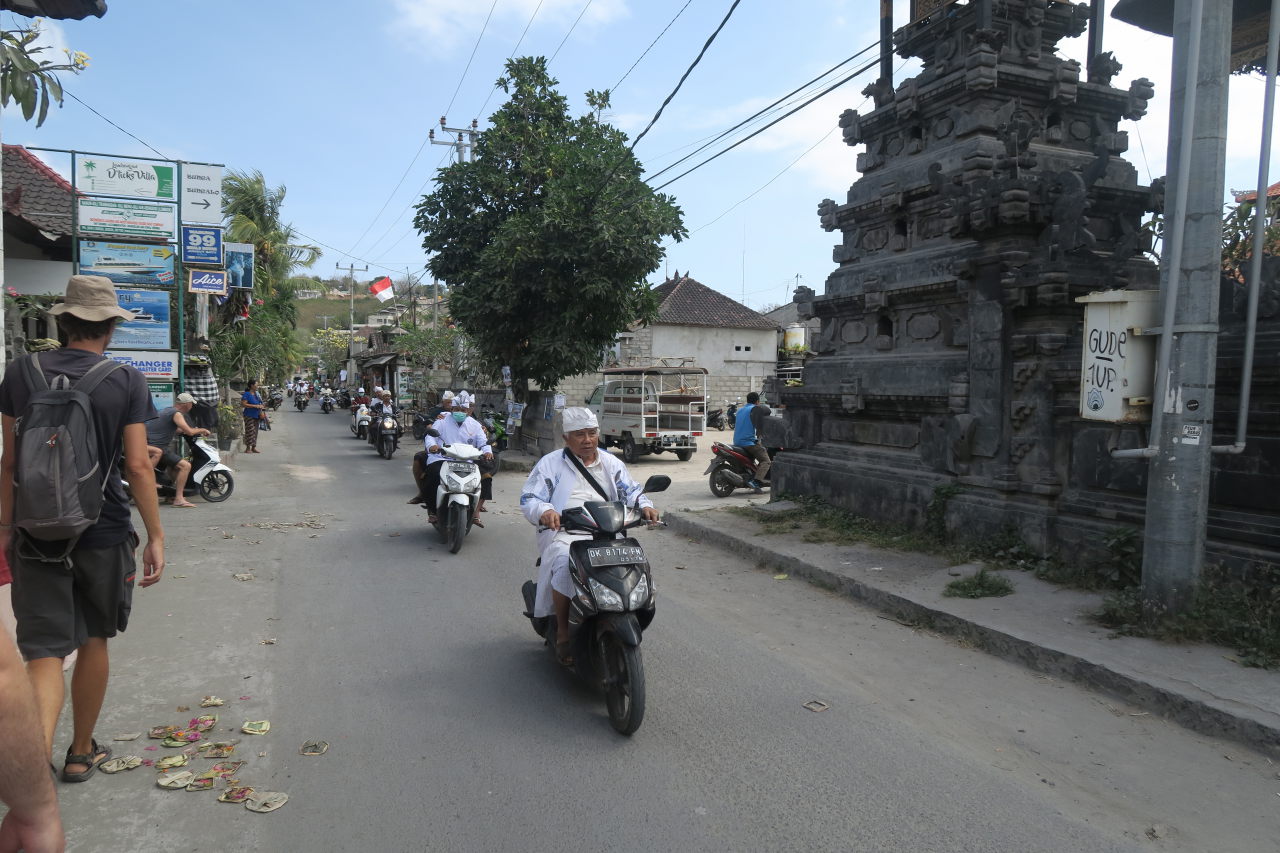 Photo de balinais en habits traditionnels, sortant d’un temple en scooters. Notez les offrandes écrasées aux pieds de Julien