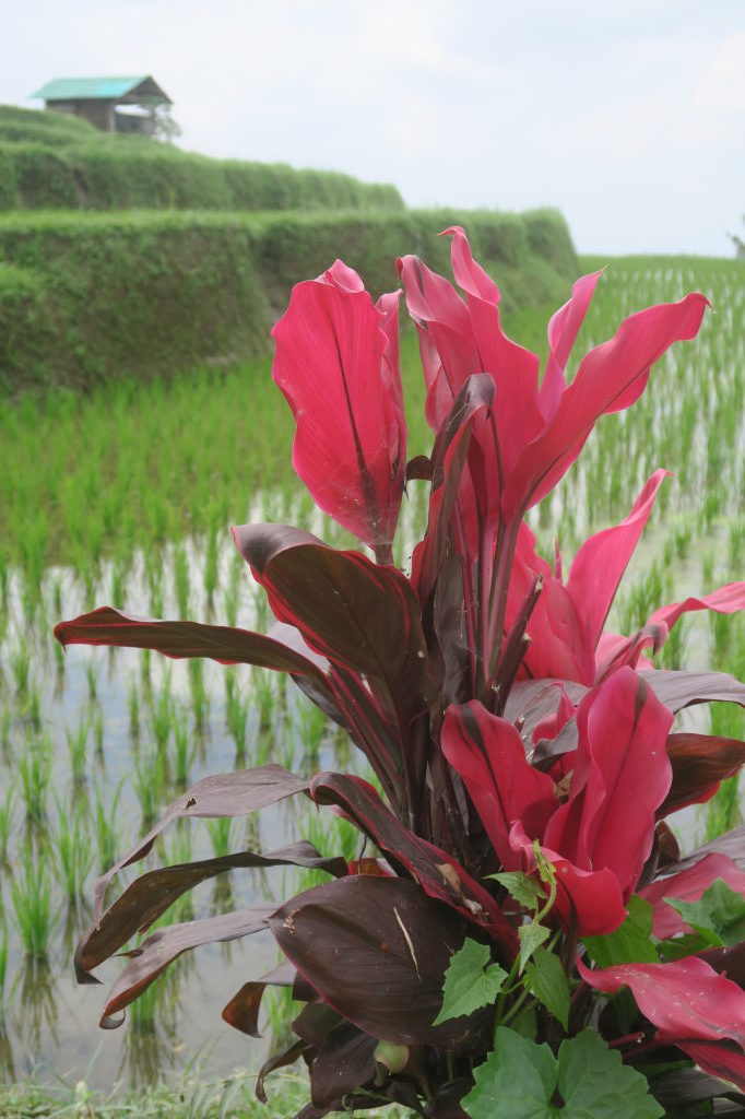 Une plante tropicale aux feuilles rouges devant une rizière, Jatiluwih