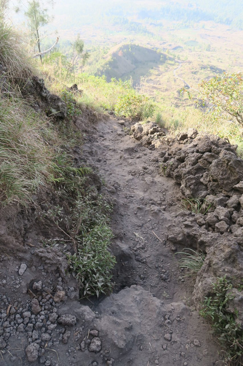 Le chemin : de la poussière, et des roches qui roulent sous les pieds. Il faut se méfier à la descente !