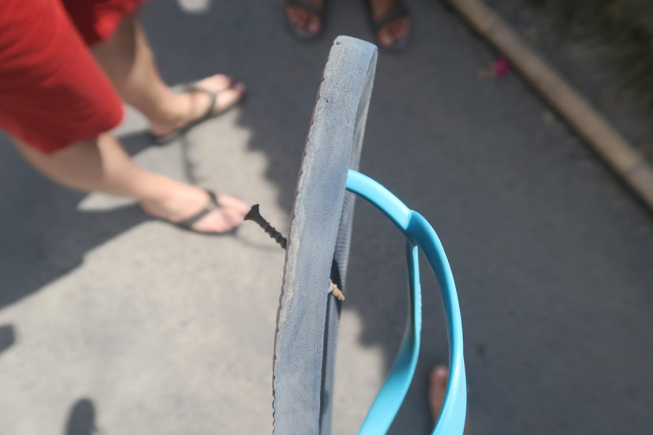 Accident de la route ! Elise s’est enfoncé un clou rouillé dans la tong ! Plus de peur que de mal…