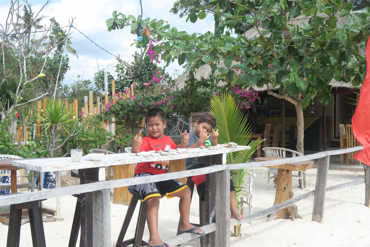 Deux garçons sur la plage, vendant des cailloux pour faire des ricochets. Lors de la photo, un des gamins fait ce geste déplacé…