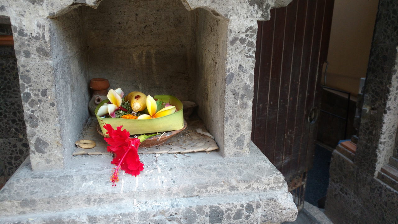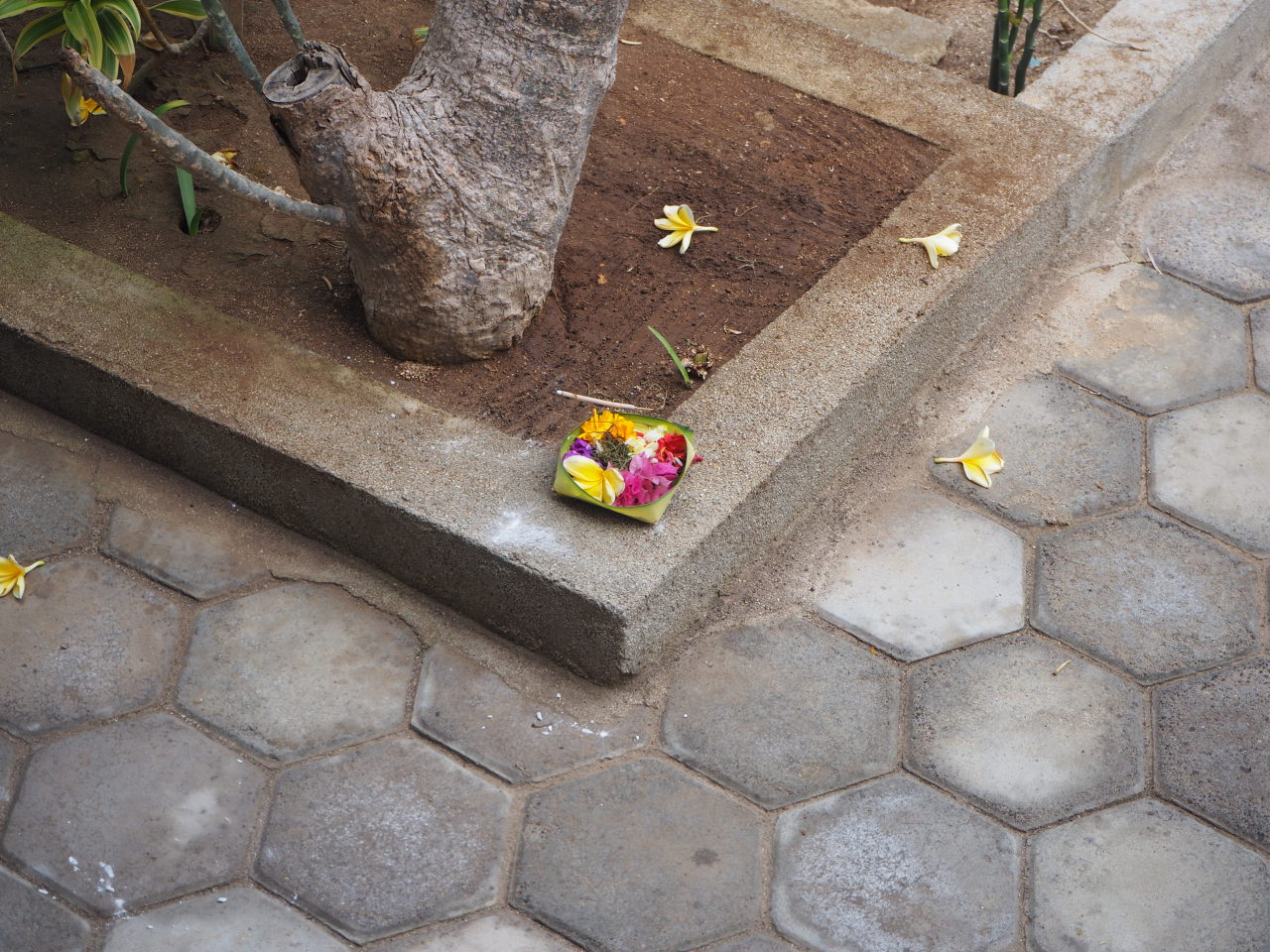 Offrandes déposées le matin (et rapidement piétinées par les passants)