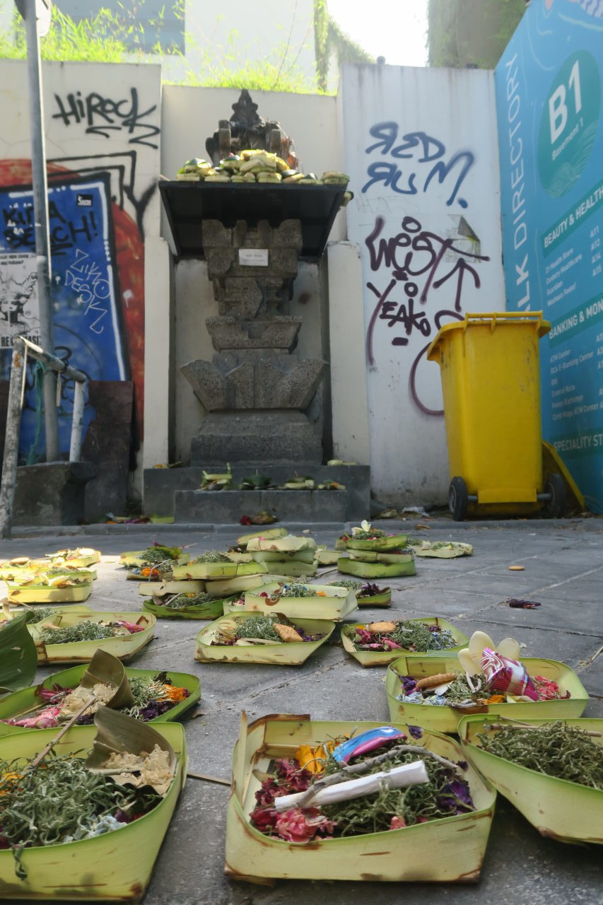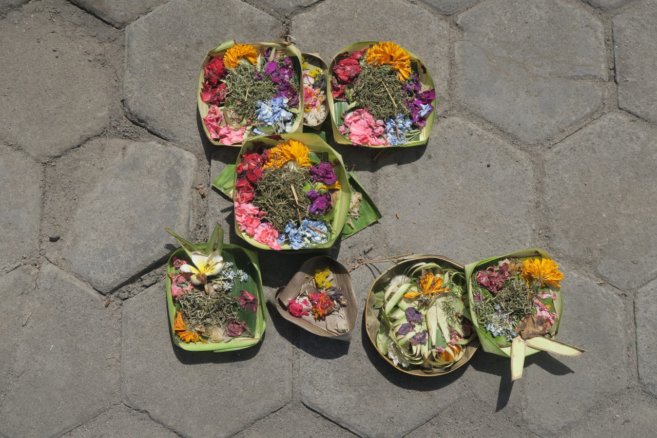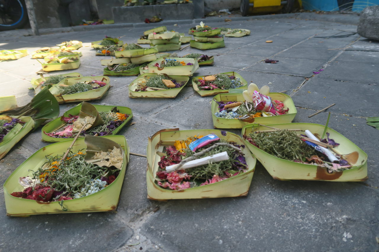 Parterre d’offrandes, au détour d’une ruelle, à Kuta