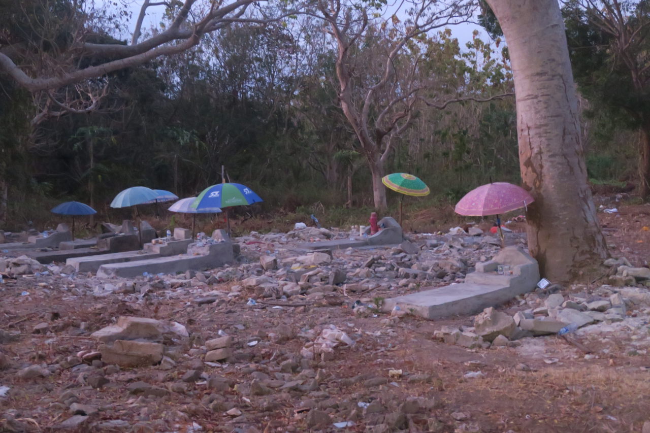 Tombes protégées du soleil par des parapluies (qui ont plusieurs connotations dans la culture balinaise)