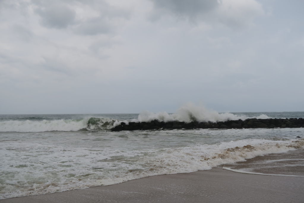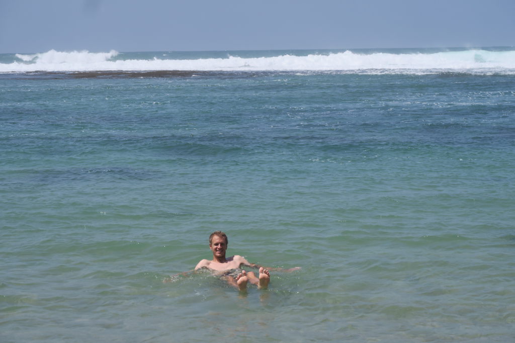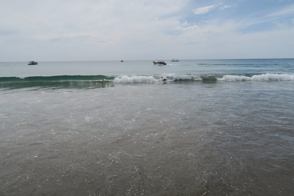 Julien joue dans les vagues (il est bien caché dans le rouleau)