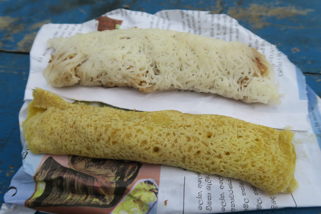 Désserts srilankais : Wellawahum et sring hopper sucré farci d’un mélange de coco et de jaggery.
