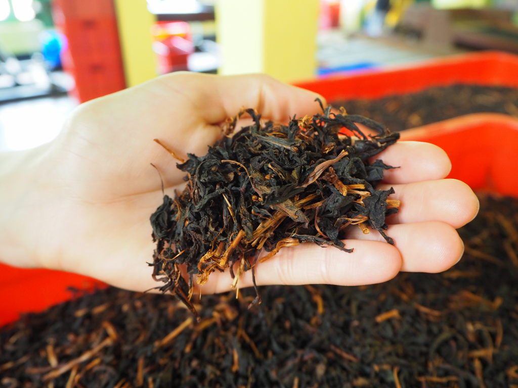 Feuilles de thé séchées, avec des restes de branches