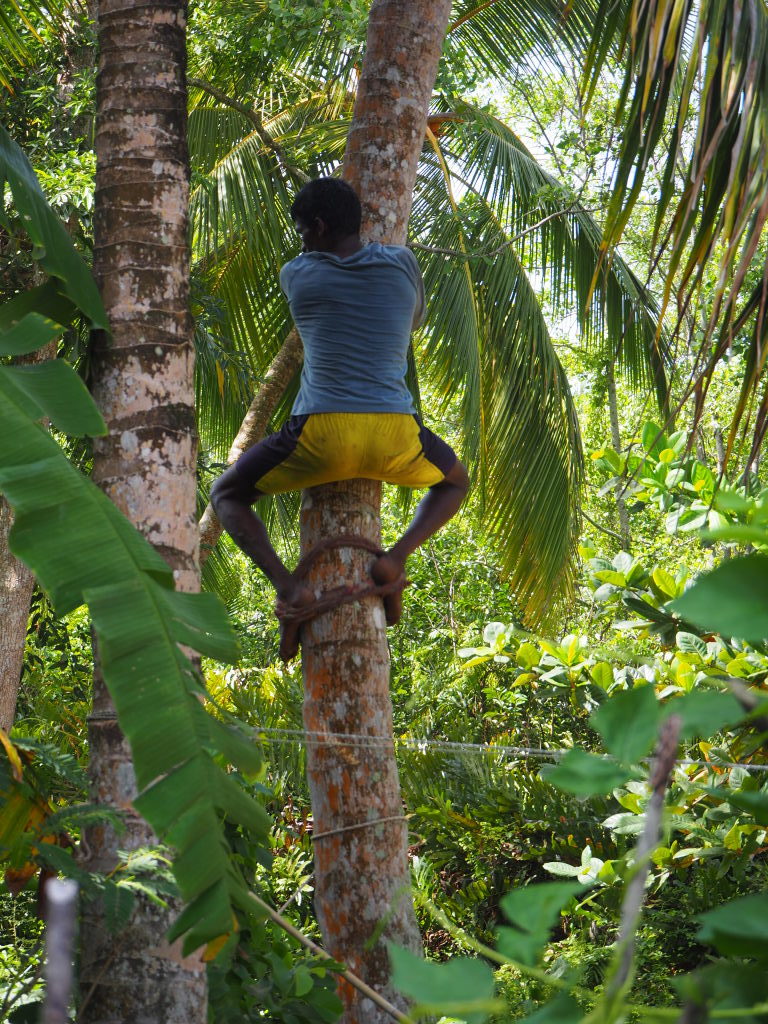 La technique de progression sur cocotier. Notez le tissu enroulé autour des pieds.